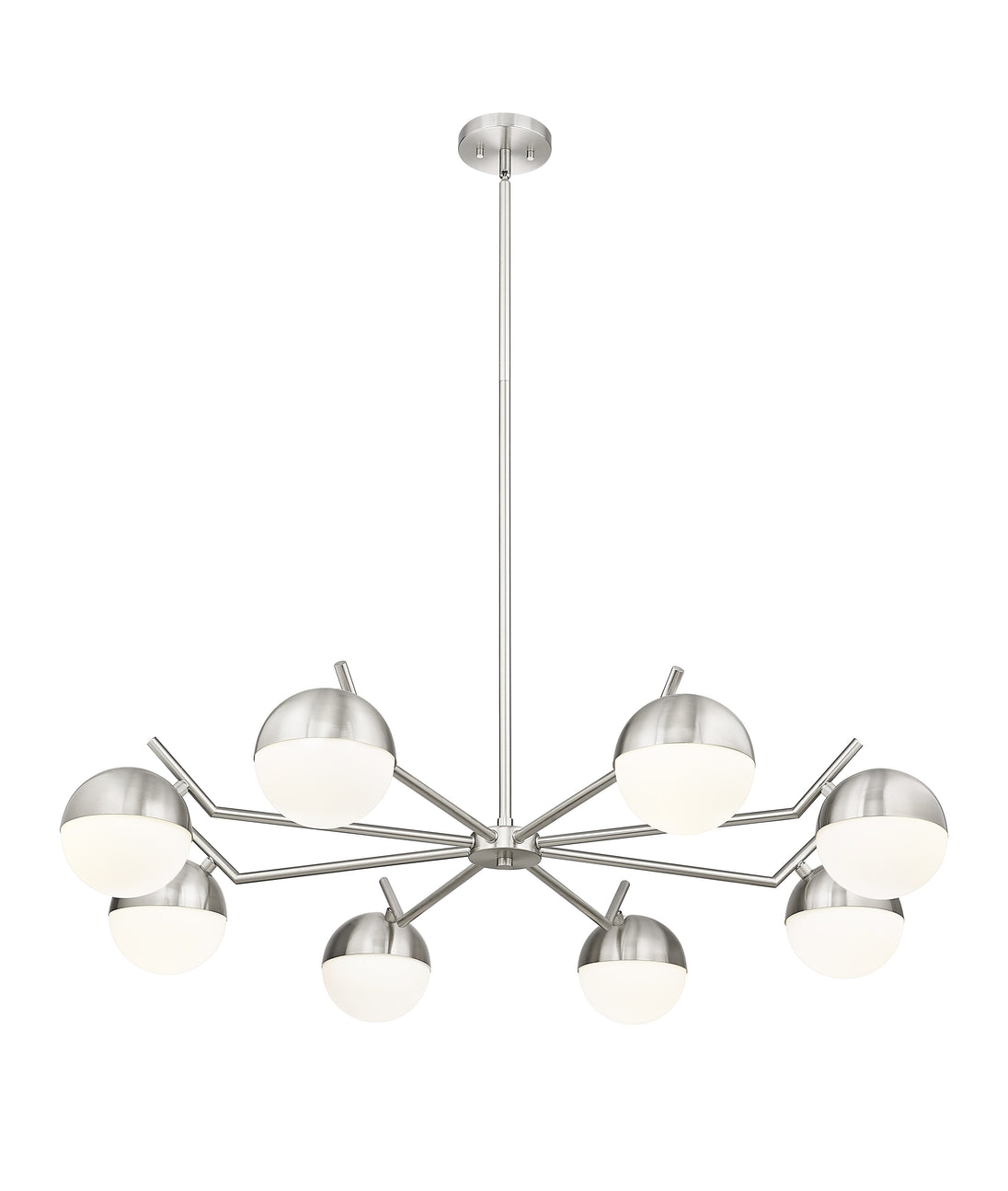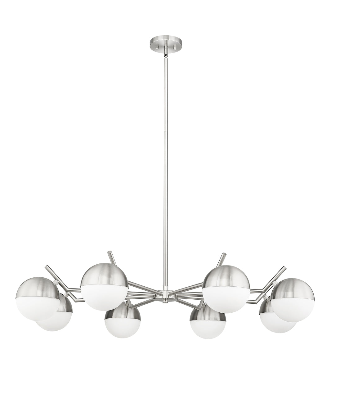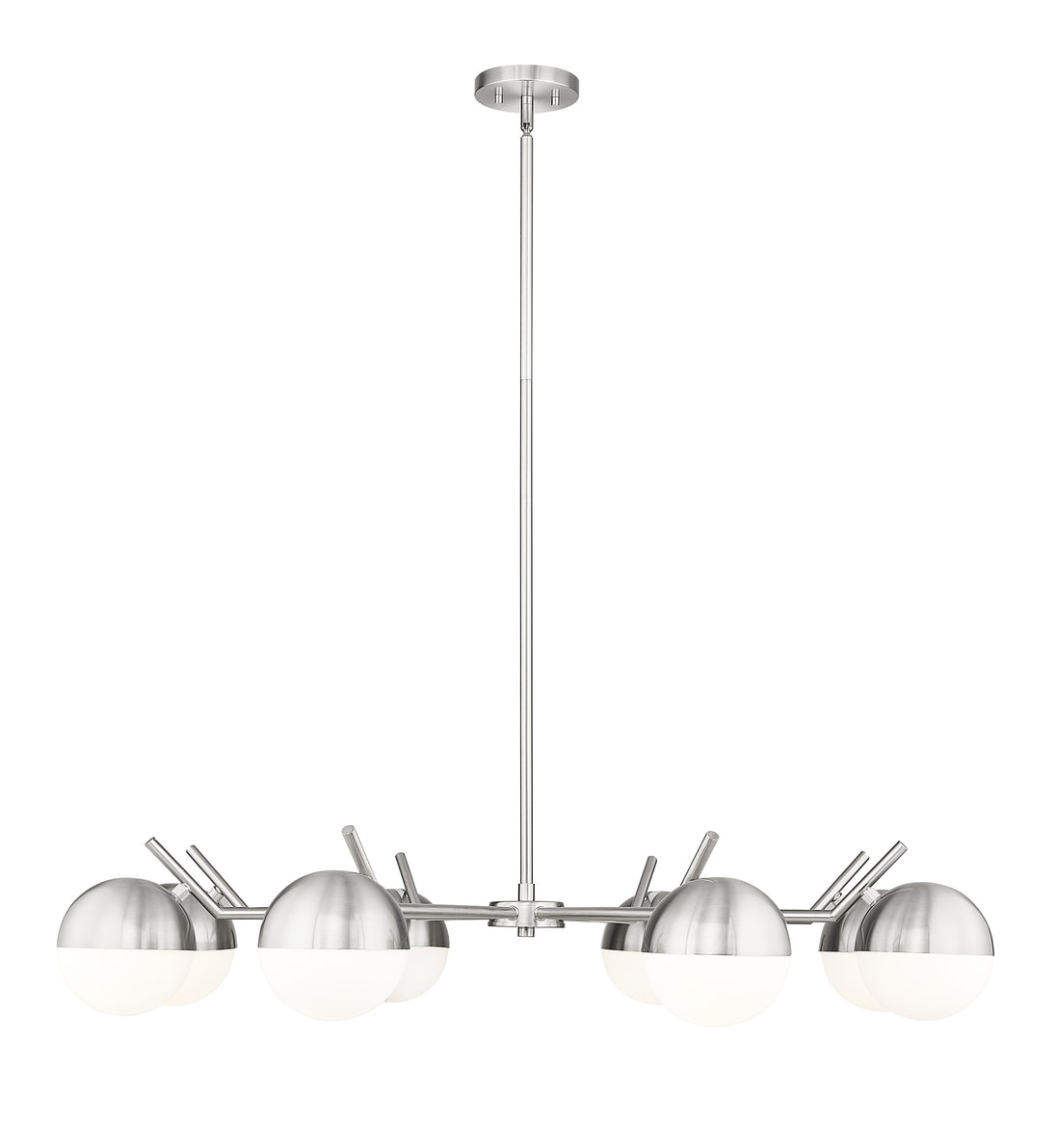 Set the stage for contemporary elegance with this modern eight-light chandelier. It showcases a clean-lined profile emphasized with its brushed nickel finish. Orb shades in matte opal glass cast inviting illumination, perfect for a welcoming kitchen or dining room table.