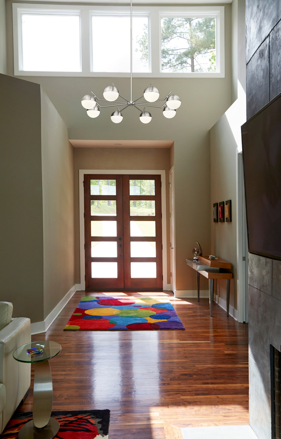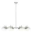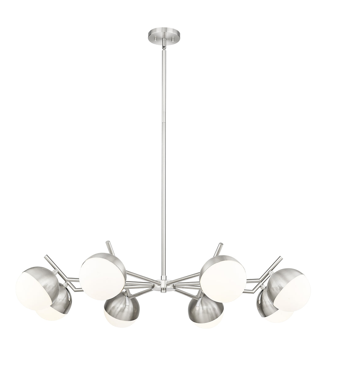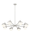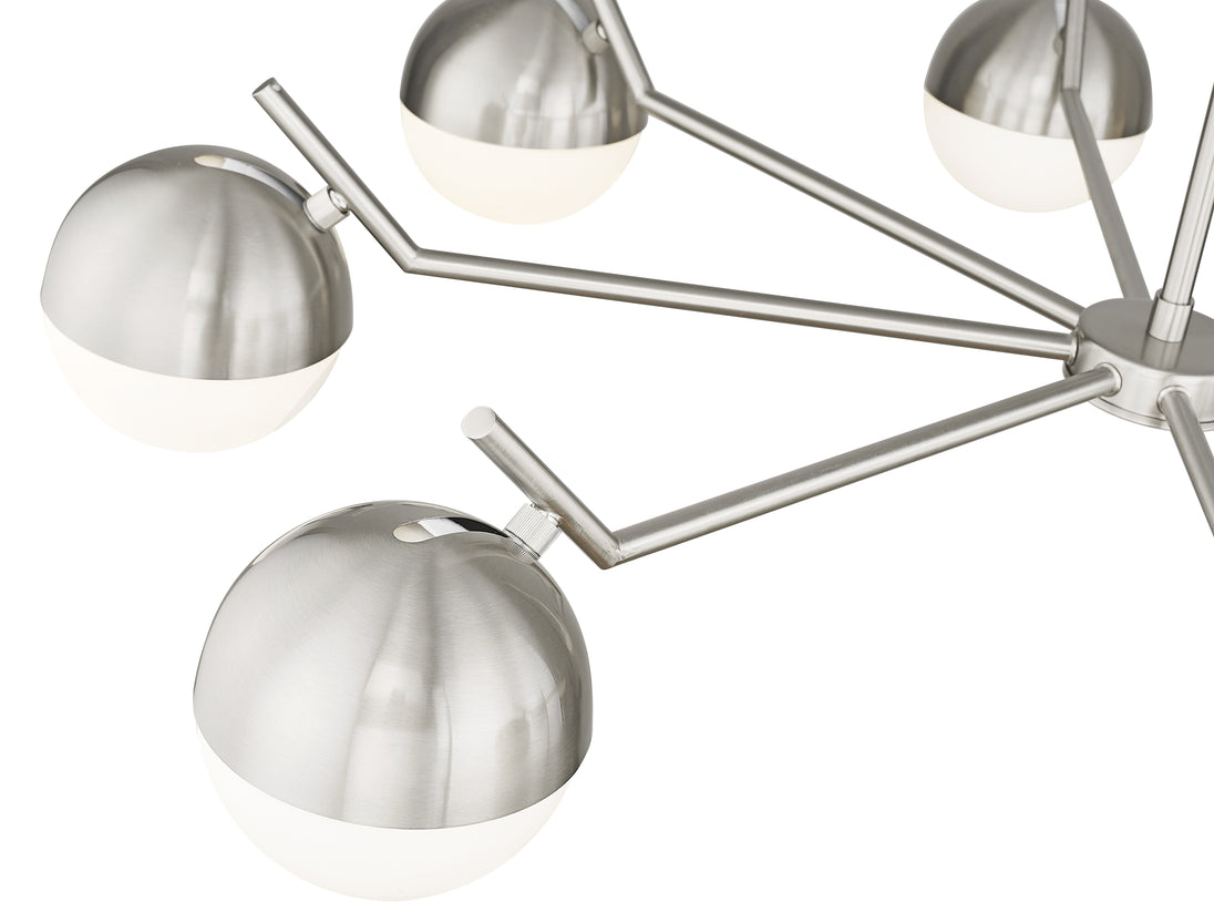 Set the stage for contemporary elegance with this modern eight-light chandelier. It showcases a clean-lined profile emphasized with its brushed nickel finish. Orb shades in matte opal glass cast inviting illumination, perfect for a welcoming kitchen or dining room table.