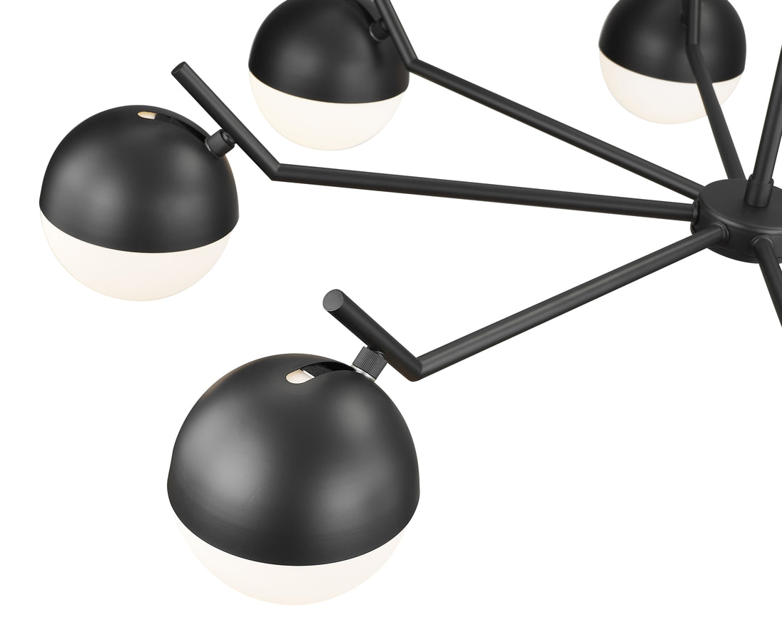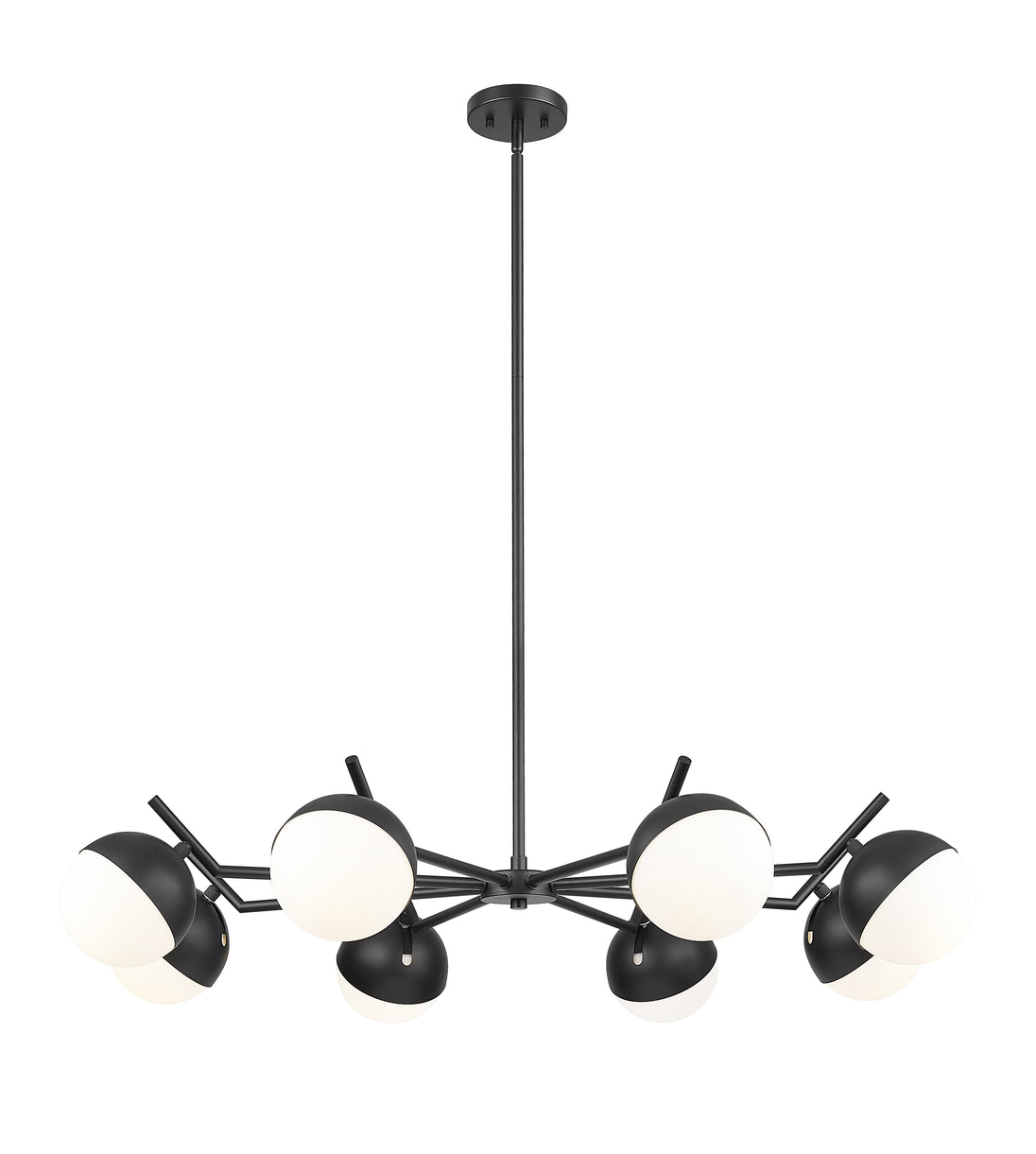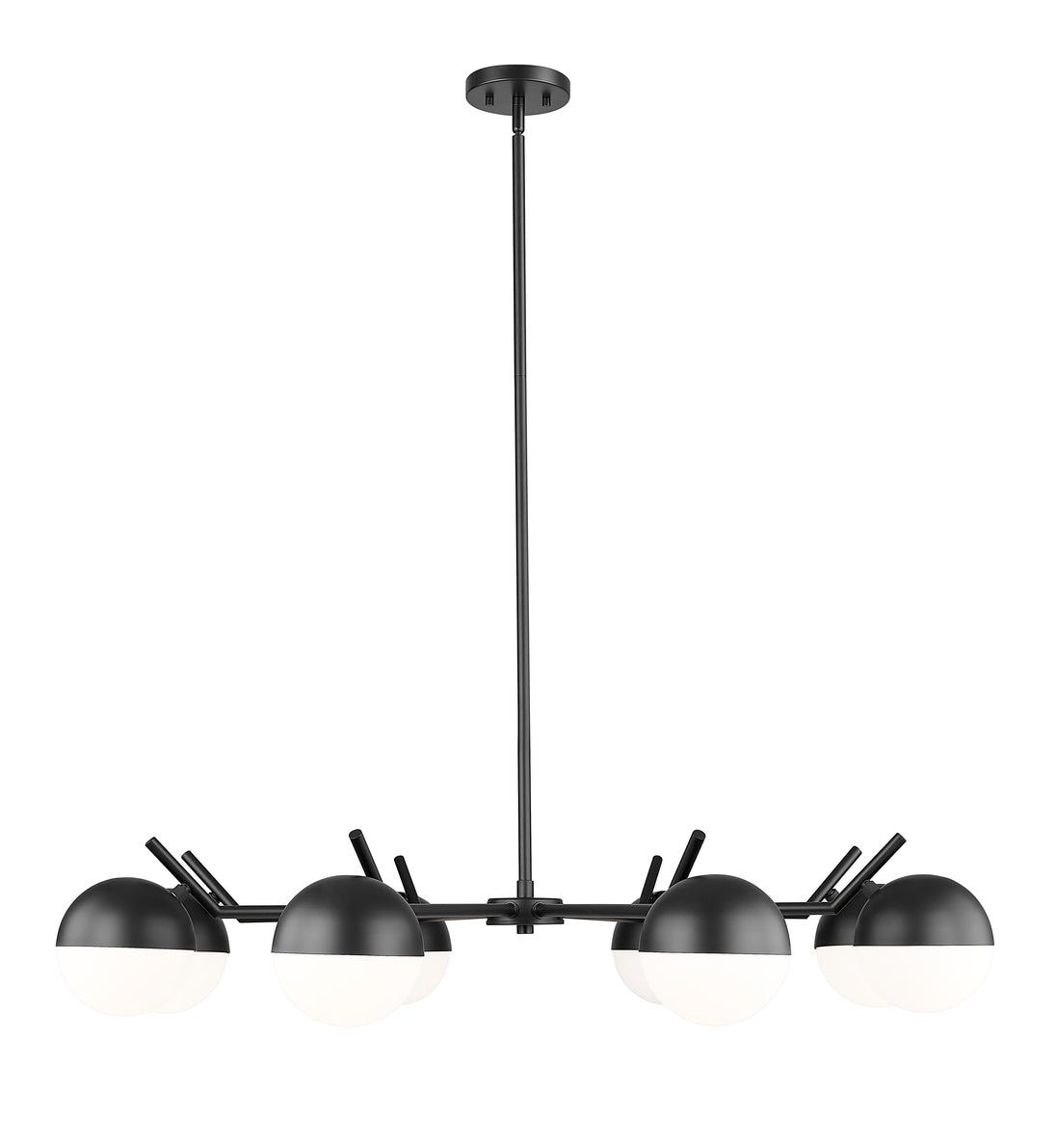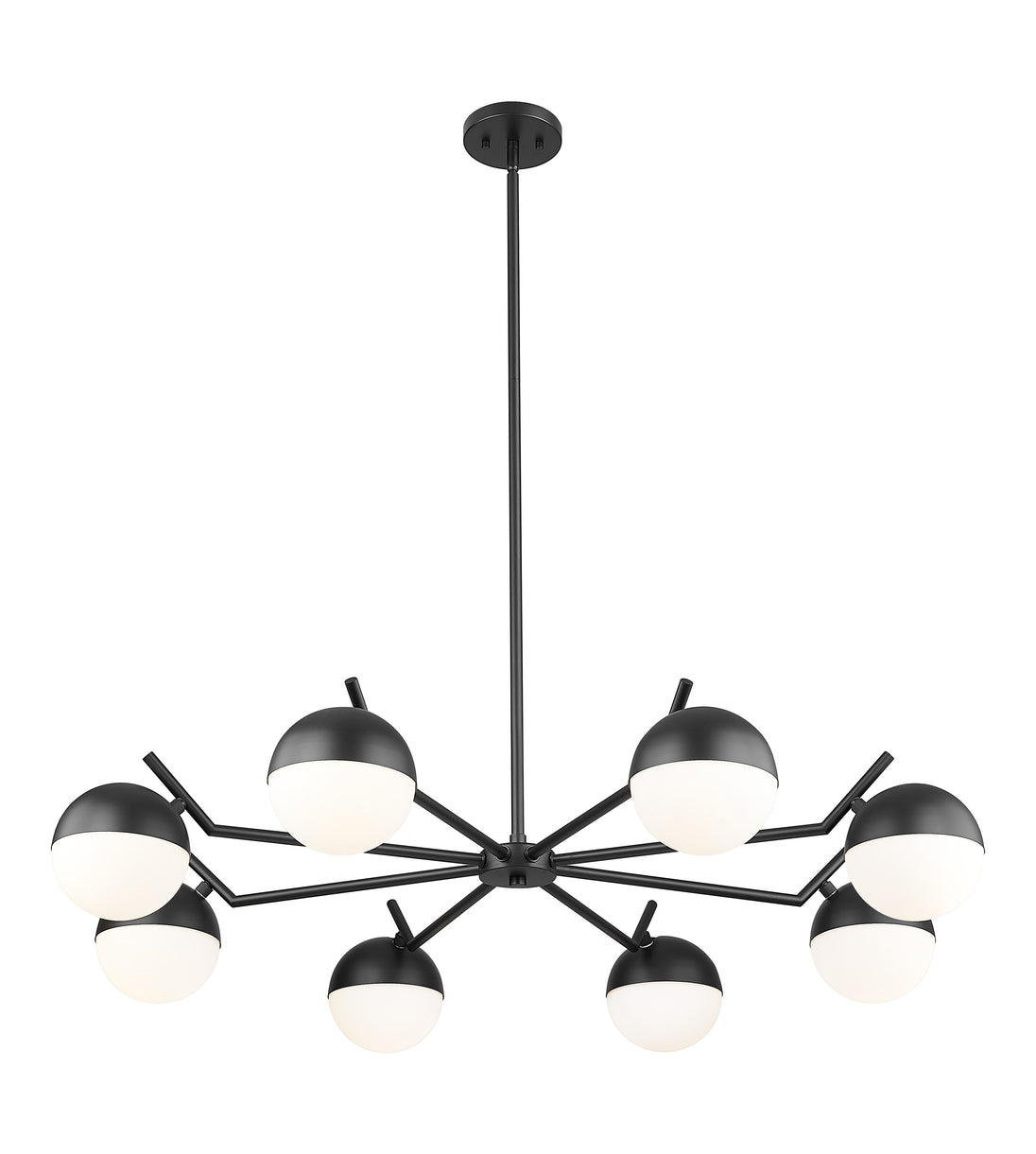 Matte black maximizes contrast and dimensionality for this modern eight-light chandelier. Its inspired design takes vintage details and makes them modern, from angular arms to orb shades that pair metal shields and matte opal glass. It's the perfect way to create an inviting ambiance for your chic dining room.