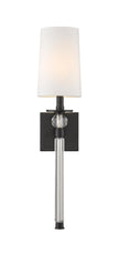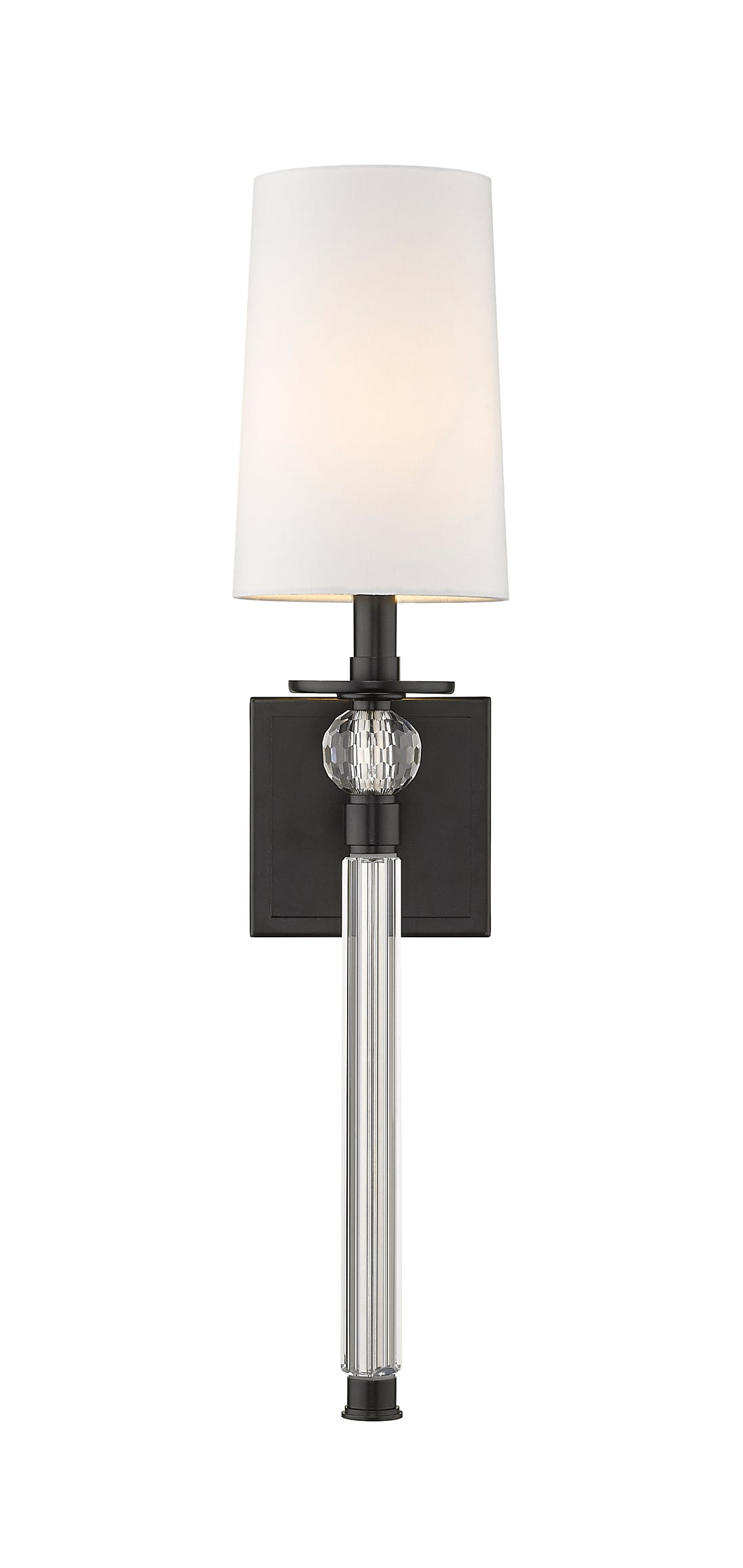 Light up a powder room, bedroom, or hallway with the exquisite artistry of this one-light wall sconce. A traditional lamp motif is modernized with tailored design elements featuring matte black finish steel and crystal. Topped with a fresh white fabric shade, this sconce becomes part of a sophisticated look in a contemporary or transitional space.