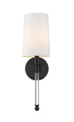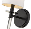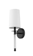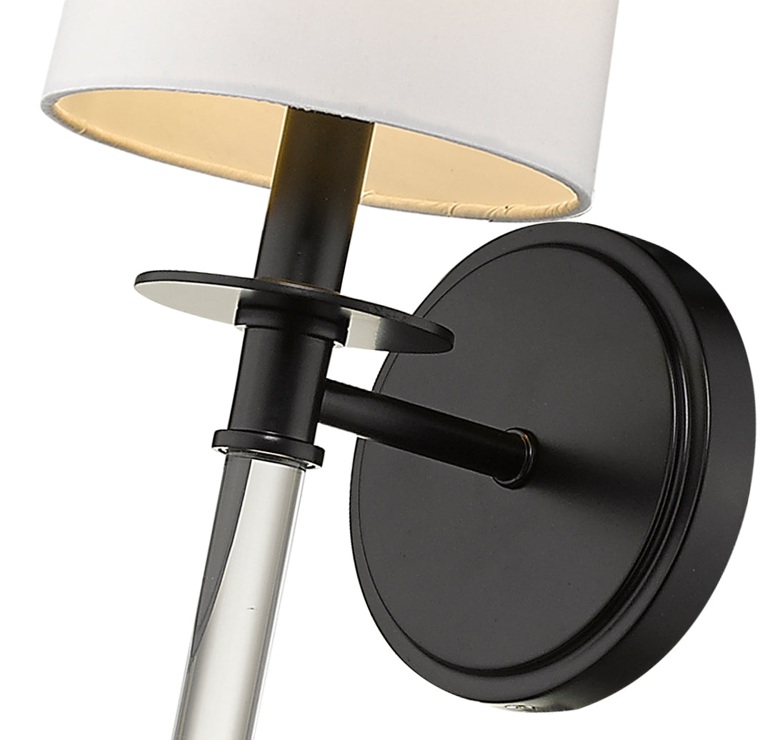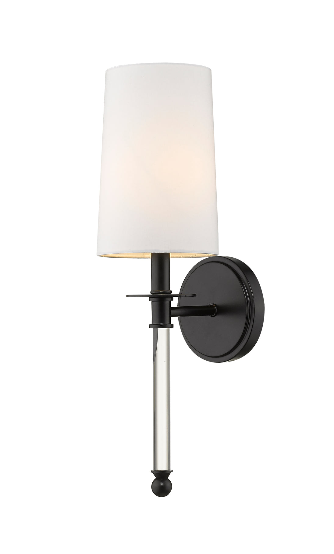 Graceful modern design creates a lift for contemporary bathrooms, bedrooms, and hallways with this elegant one-light wall sconce. Indulge in an artistic linear silhouette blending matte black finish steel with delicate crystal, forming an enticing vertical stem. A fresh white fabric shade seals the classic look of this sconce, a perfect solution for a challenge of extra lighting.