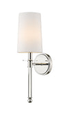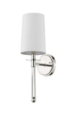 Graceful modern design creates a lift for contemporary bathrooms, bedrooms, and hallways with this elegant one-light wall sconce. Indulge in an artistic linear silhouette blending polished nickel finish steel with delicate crystal, forming an enticing vertical stem. A fresh white fabric shade seals the classic look of this sconce, a perfect solution for a challenge of extra lighting.