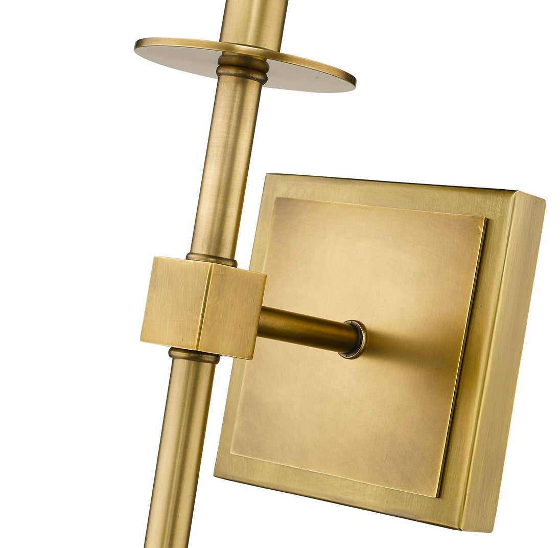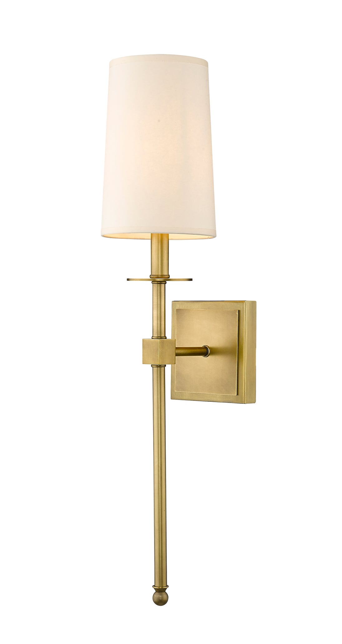 Long lines and an elegantly simple motif lend sophistication to this contemporary rubbed brass finish one-light wall sconce. Mirroring a traditional lamp motif, its steel frame and wall mount join a tall white fabric shade to form a decadent look with versatility for use in a bathroom, bedroom, or hallway.