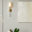 Long lines and an elegantly simple motif lend sophistication to this contemporary rubbed brass finish one-light wall sconce. Mirroring a traditional lamp motif, its steel frame and wall mount join a tall white fabric shade to form a decadent look with versatility for use in a bathroom, bedroom, or hallway.