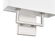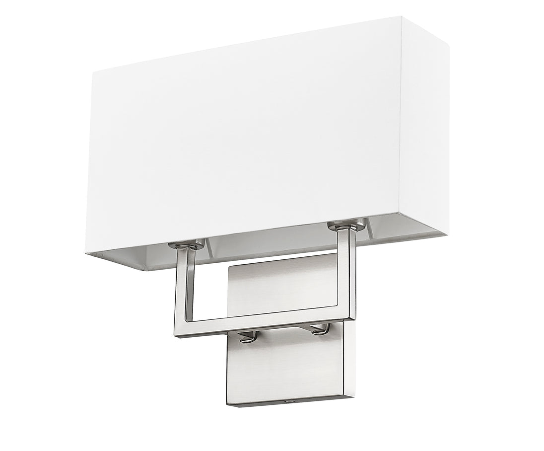 A low profile and structured arm design create a fresh, modern style for this contemporary two-light wall sconce. In a brushed nickel finish over steel construction, it boasts a square wall plate and white half-shade, offering a perfect complement to your hall or living room.