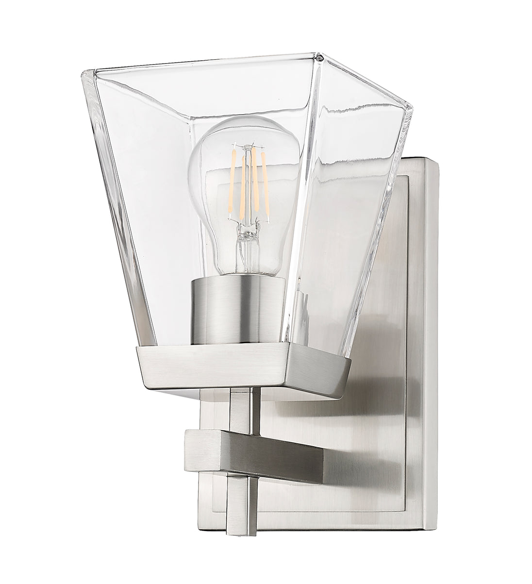 Flared glass perfectly accentuates the clean precision of a modern one-light wall sconce. From the Lauren collection, this sleek design is deceptively simple, delivering a flared clear glass shade topping a clean-lined frame in a gleaming brushed nickel finish that offers contemporary ambiance to a wide variety of spaces and interior designs.