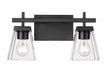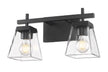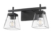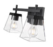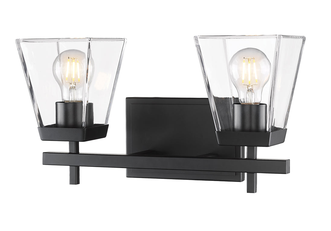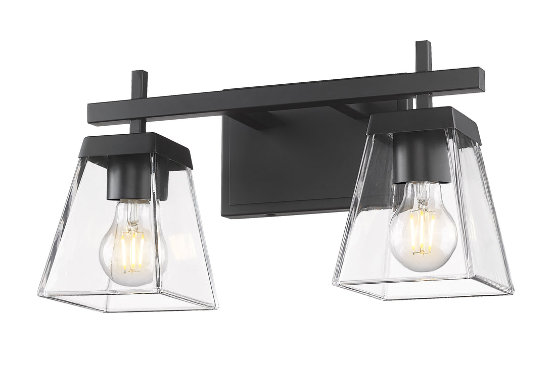 Long, lean lines encourage the clean, simple precision of this modern two-light vanity sconce. Perfect for delivering bright, direct illumination, the sconce features a pair of flared shades, each crafted in clear glass and perched within a matte black finish frame. Mount this sconce with lights up or down to create a spa-like bathroom ambiance.