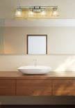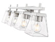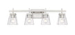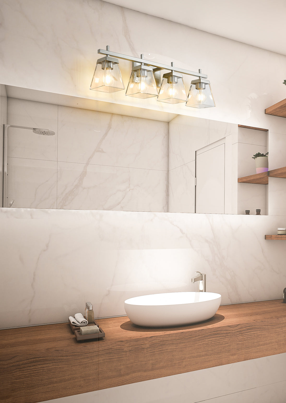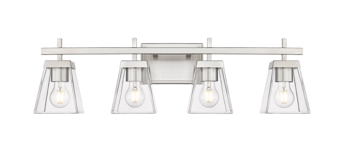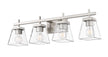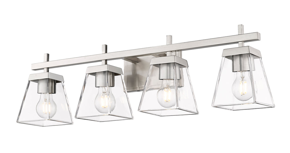 Straight lines and chic angles create a compelling, Zen-inspired silhouette for this modern four-light bathroom vanity wall light. From the Lauren collection, the sconce boasts a clean, straight bar hosting a quartet of clear glass shades that may be mounted up or down. Their flared design perfectly emphasizes the soothing style of a contemporary fixture that's beautifully accentuated with a sleek brushed nickel finish.