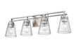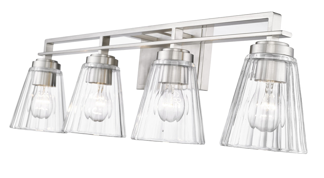 Make a design statement in a contemporary or transitional ensuite or guest bath space with an elegantly sophisticated four-light vanity light. This chic fixture from the Lyna collection reflects a touch of nautical charm and embodies the importance of symmetry and impressive artistry. A linear frame fashioned of brushed nickel finish steel supports four glam clear ribbed glass cone shades, delivering an uncompromising level of romantic essence.