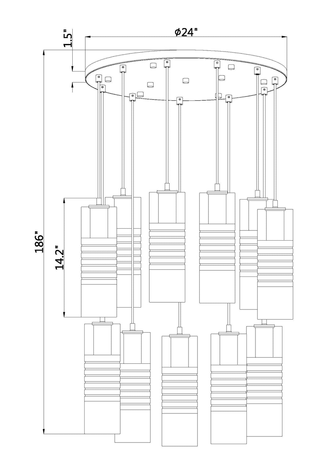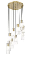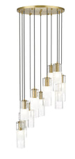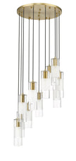 Chic artisan glass pairs with substantial steel housings to create a robust profile for a spiraling modern 11-light chandelier. Clear and frosted glass elements shade illumination to create lovely diffusion, offering exceptional ambiance over a dining table or foyer. Modern gold finish adds a warm, refined touch.