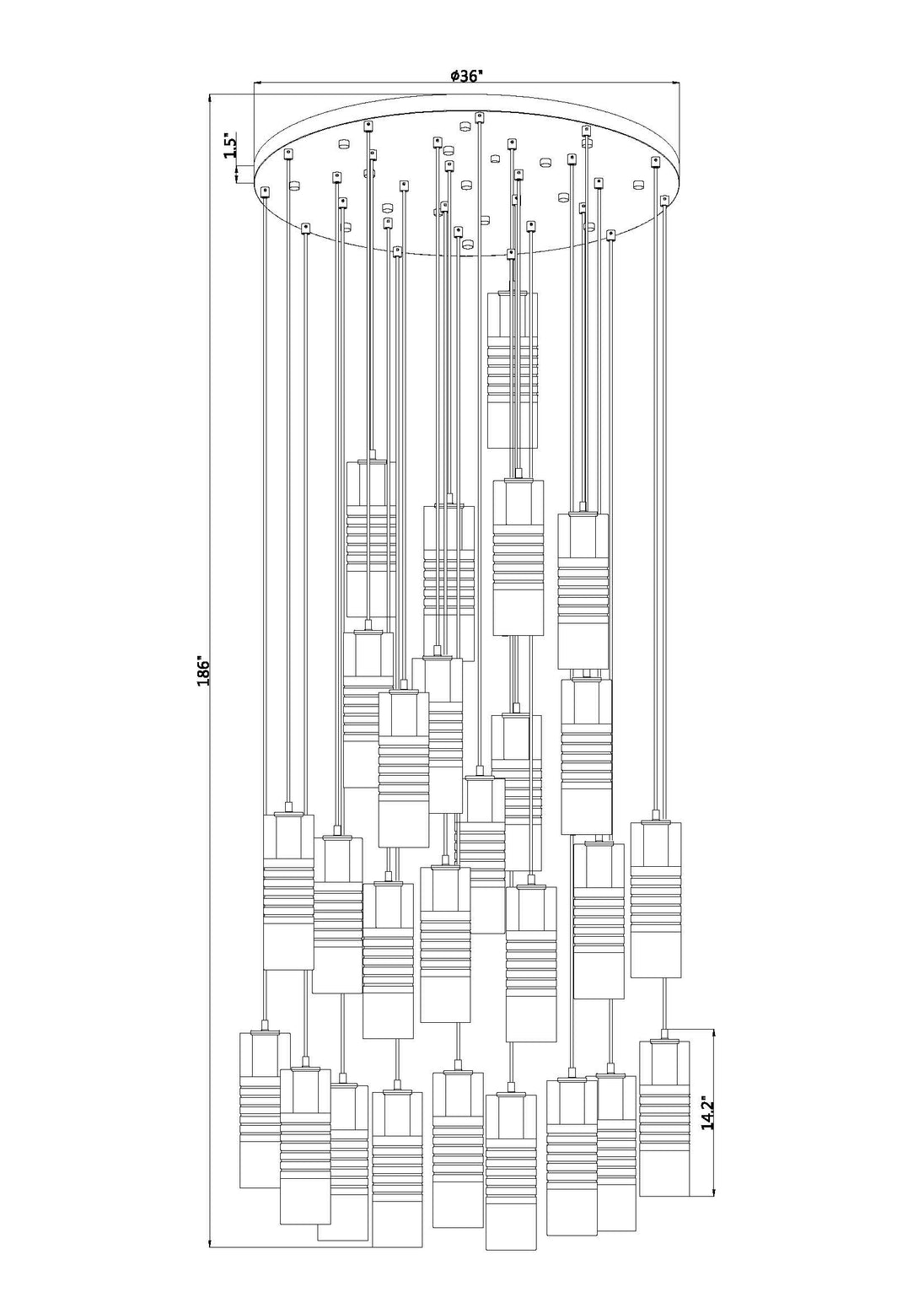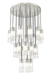 A trio of round tiers create a waterfall effect for 27 suspended lights that make up the Alton modern chandelier. Stunning over a staircase of grand dining table, it sparkles with clear and frosted glass elements and robust housings in a rich brushed nickel finish that gleams in the light.