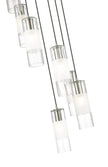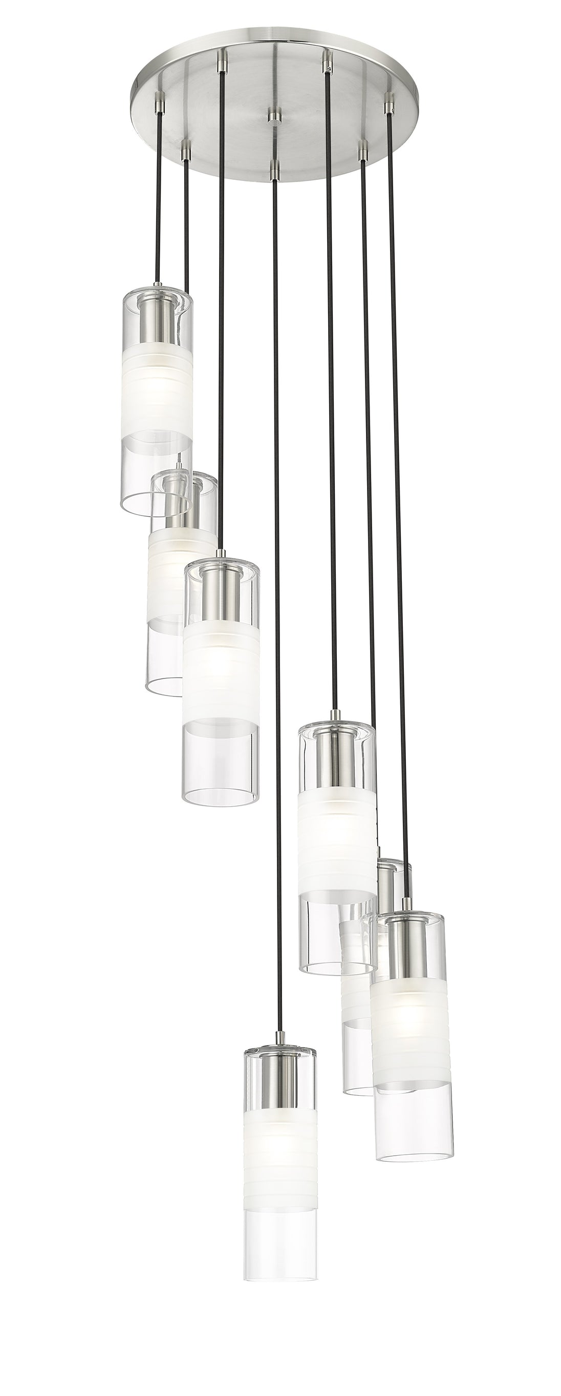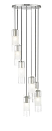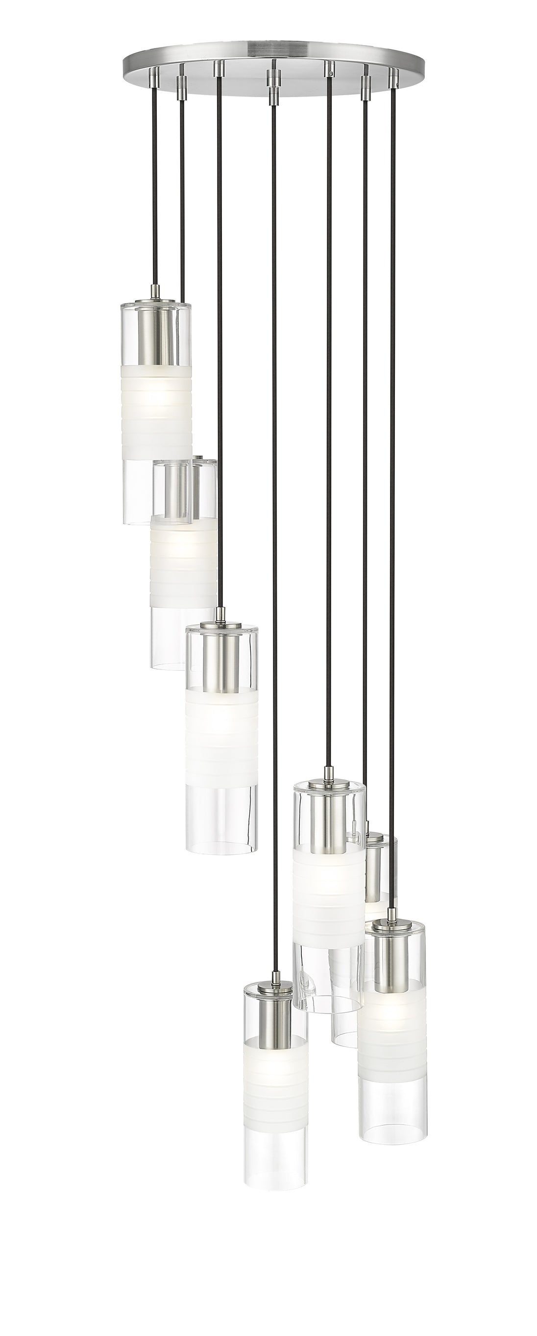 A simple spiral of lights creates a compelling silhouette for a modern seven-light chandelier. From the Alton collection, it's a refined, substantial fixture, pairing artisan clear and d frosted shades with robust housings to create a sense of detail that enhances without overwhelming. A brushed nickel finish is crisp and contemporary, beautiful over a welcoming foyer or dining table.