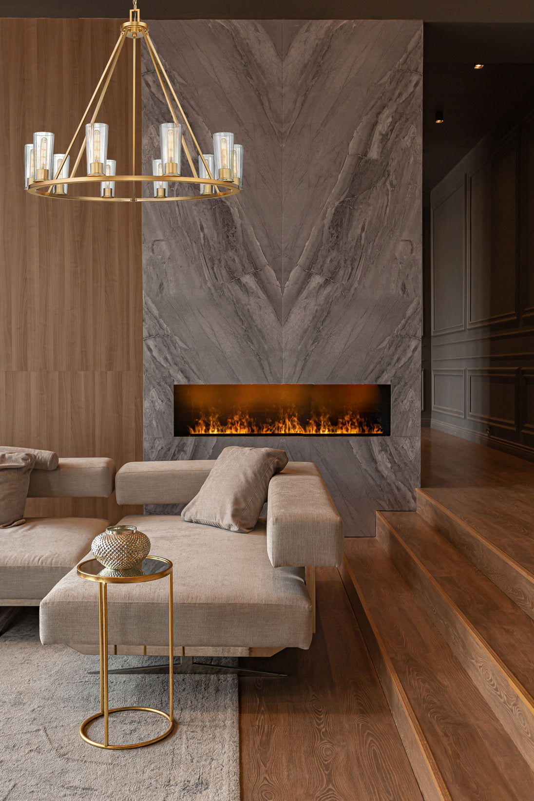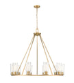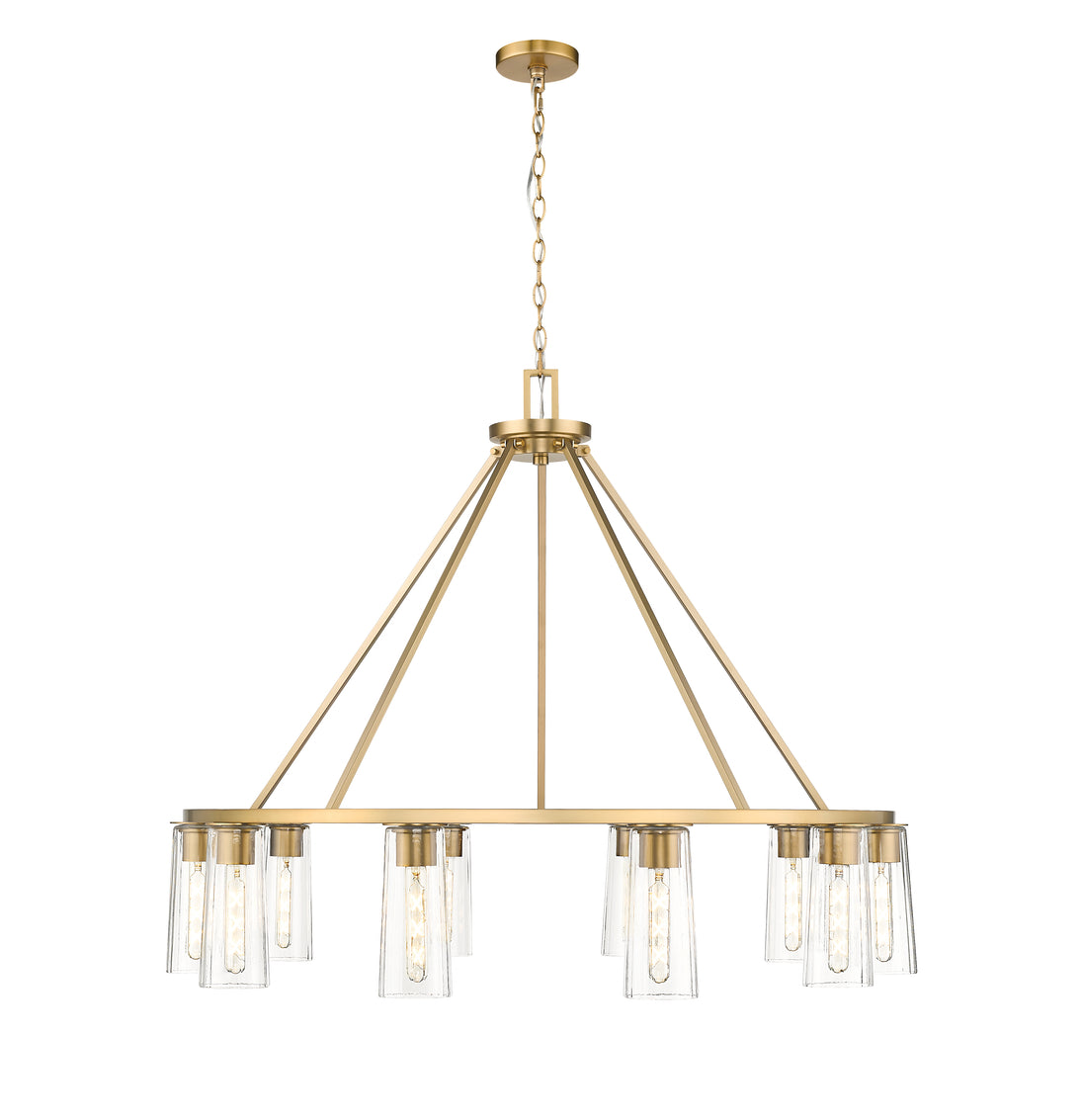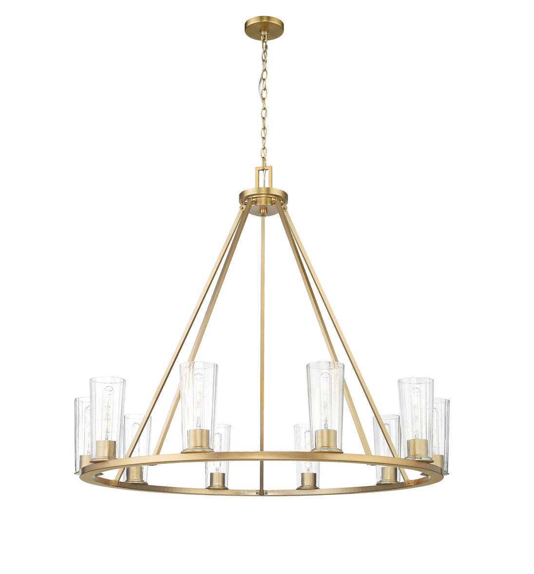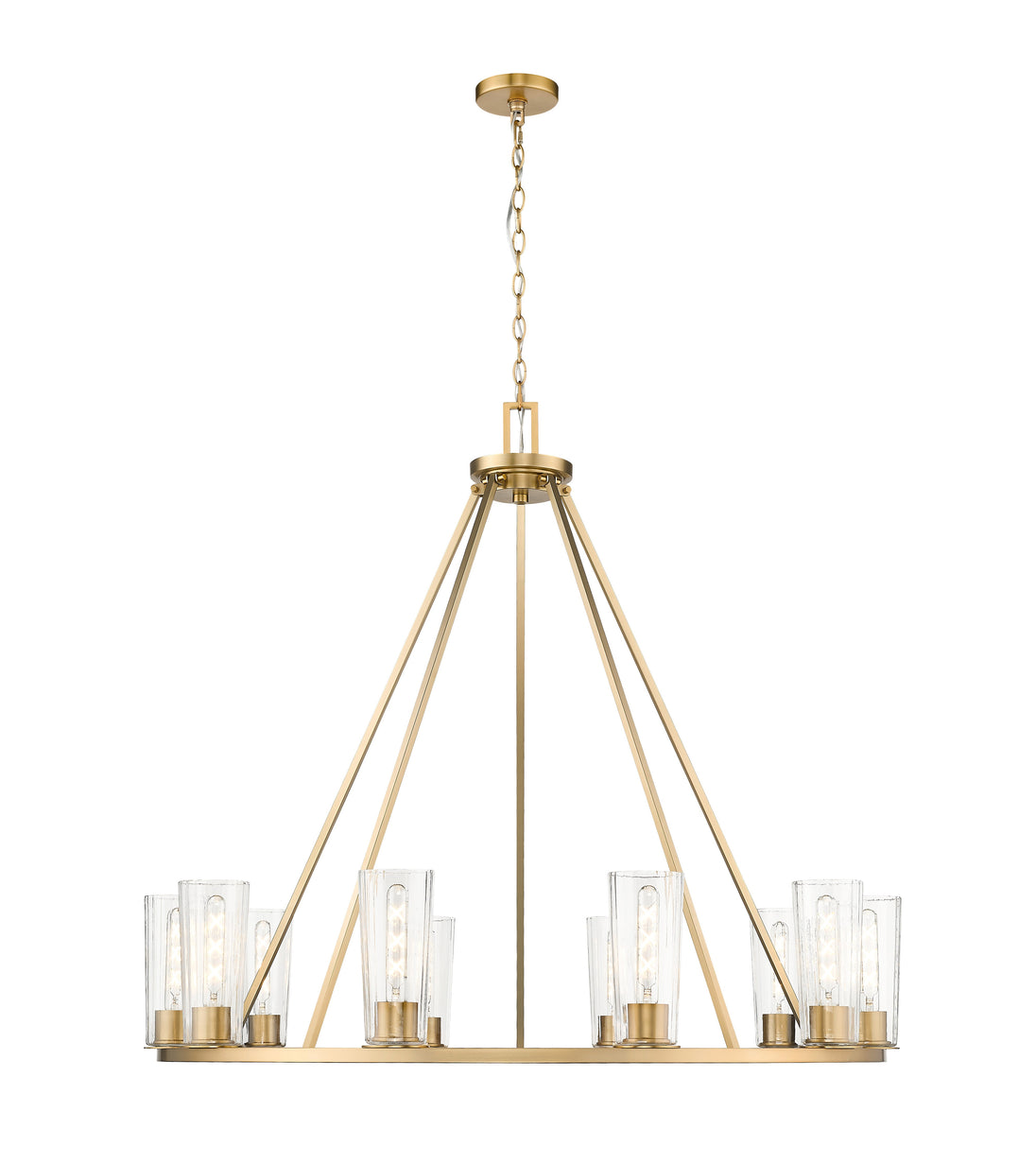 A classic ten-light ring chandelier is upgraded with the delicacy of tapered glass shades and tubular bulbs. A true statement piece over a dining table or entryway, it offers refined style with a rich modern gold finish and rods that create a chic conical silhouette. Chain suspension adds the ability to customize its drop from the ceiling to suit your space perfectly.