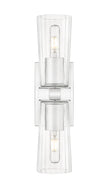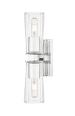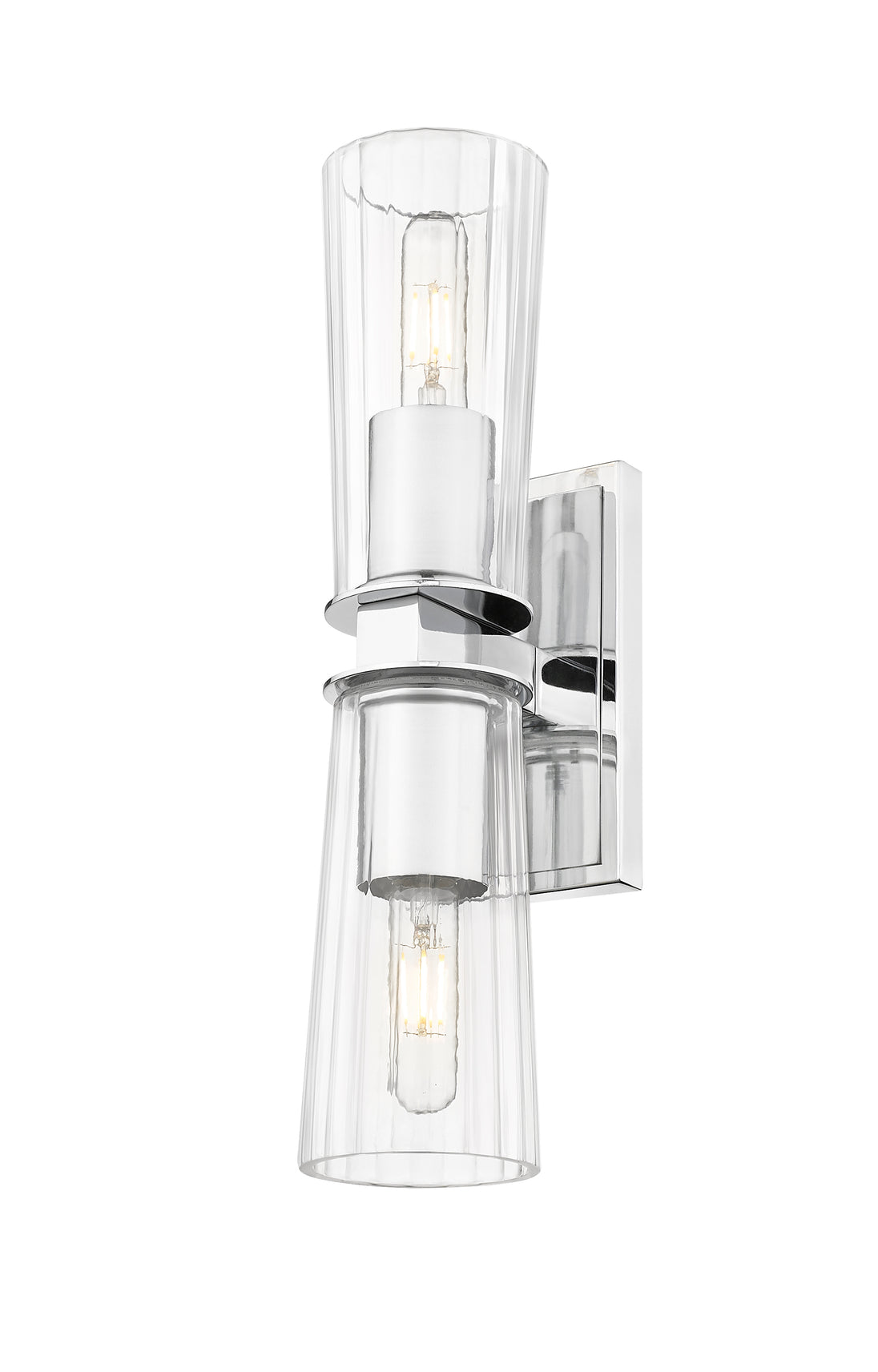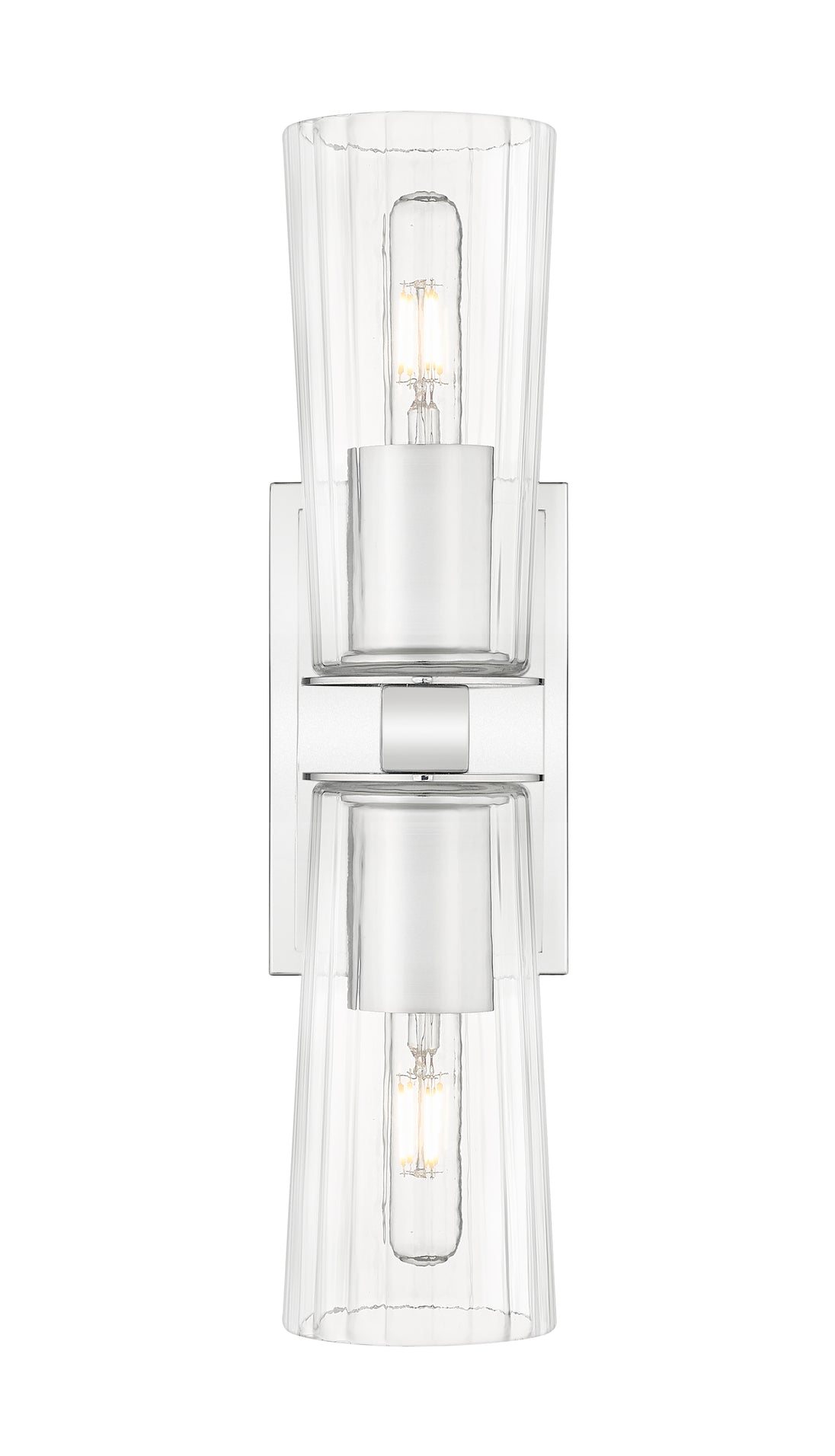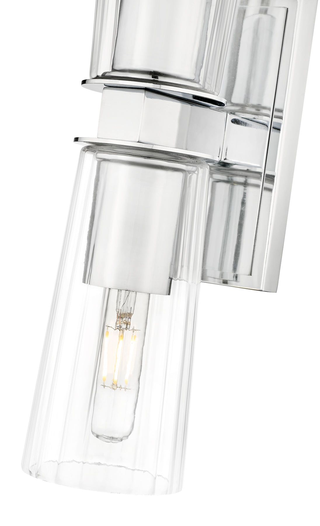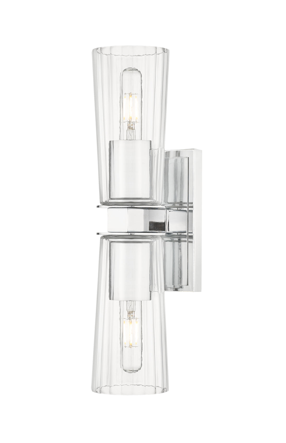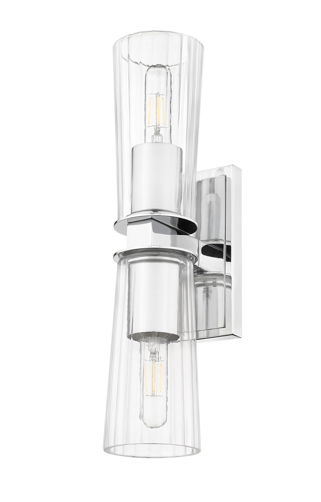 A bright chrome finish lends gleaming appeal to a modern two-light wall sconce. Delivering a symmetrical silhouette, it boasts a pair of tapered glass shades, each with a tubular bulb tucked within that adds the perfect hint of vintage allure. This sleek profile is perfect for up and down lighting within your living and dining spaces.