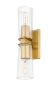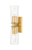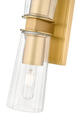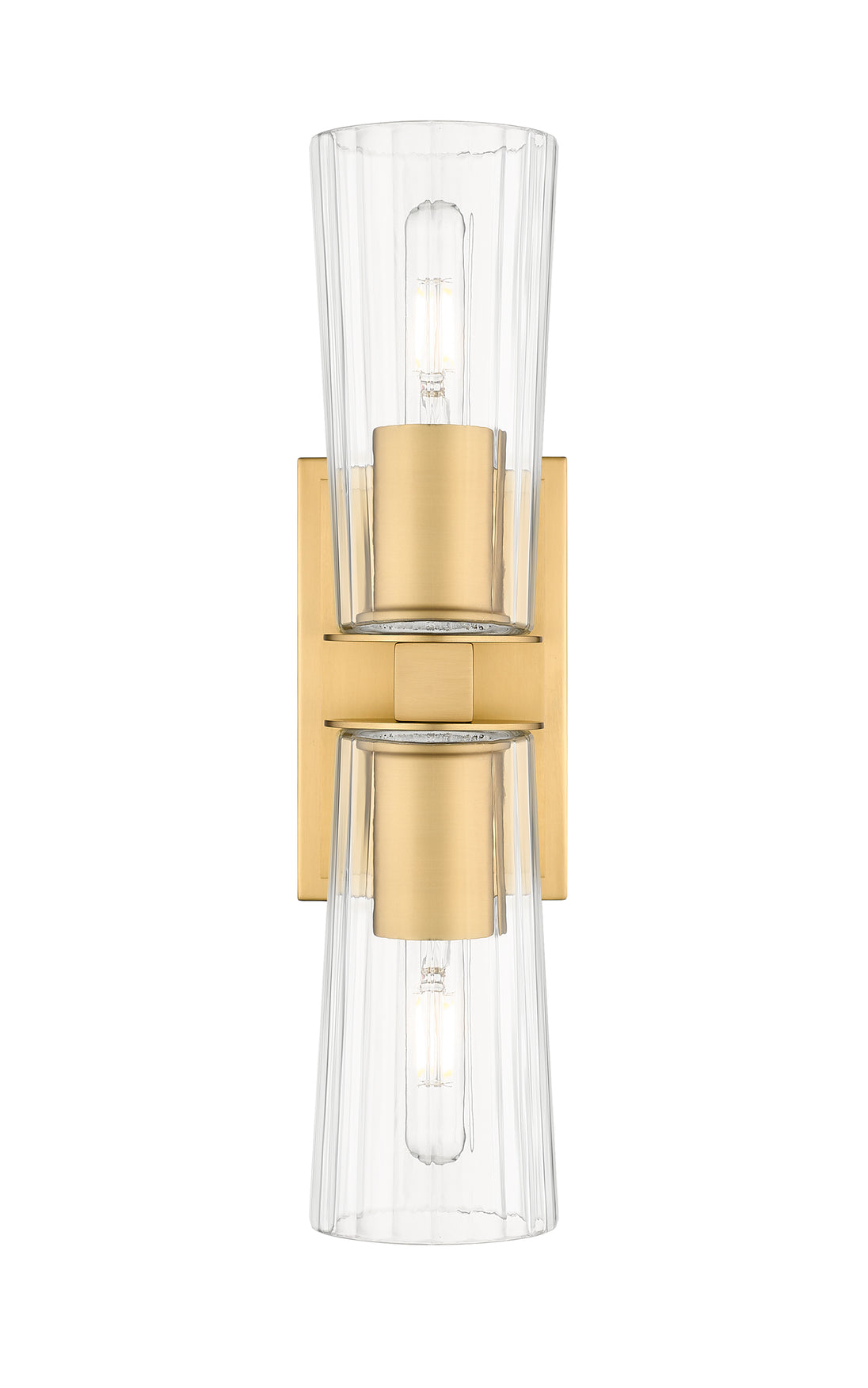 Instill a sense of sophistication with the sleek silhouette and warm modern gold finish of this contemporary two-light wall sconce. Designed to make a statement, it offers up and down lighting in any setting, lending the perfect hint of drama. Tapered shades are made in clear glass, adding delicacy to a pair of tubular bulbs that contribute vintage charm.