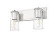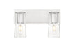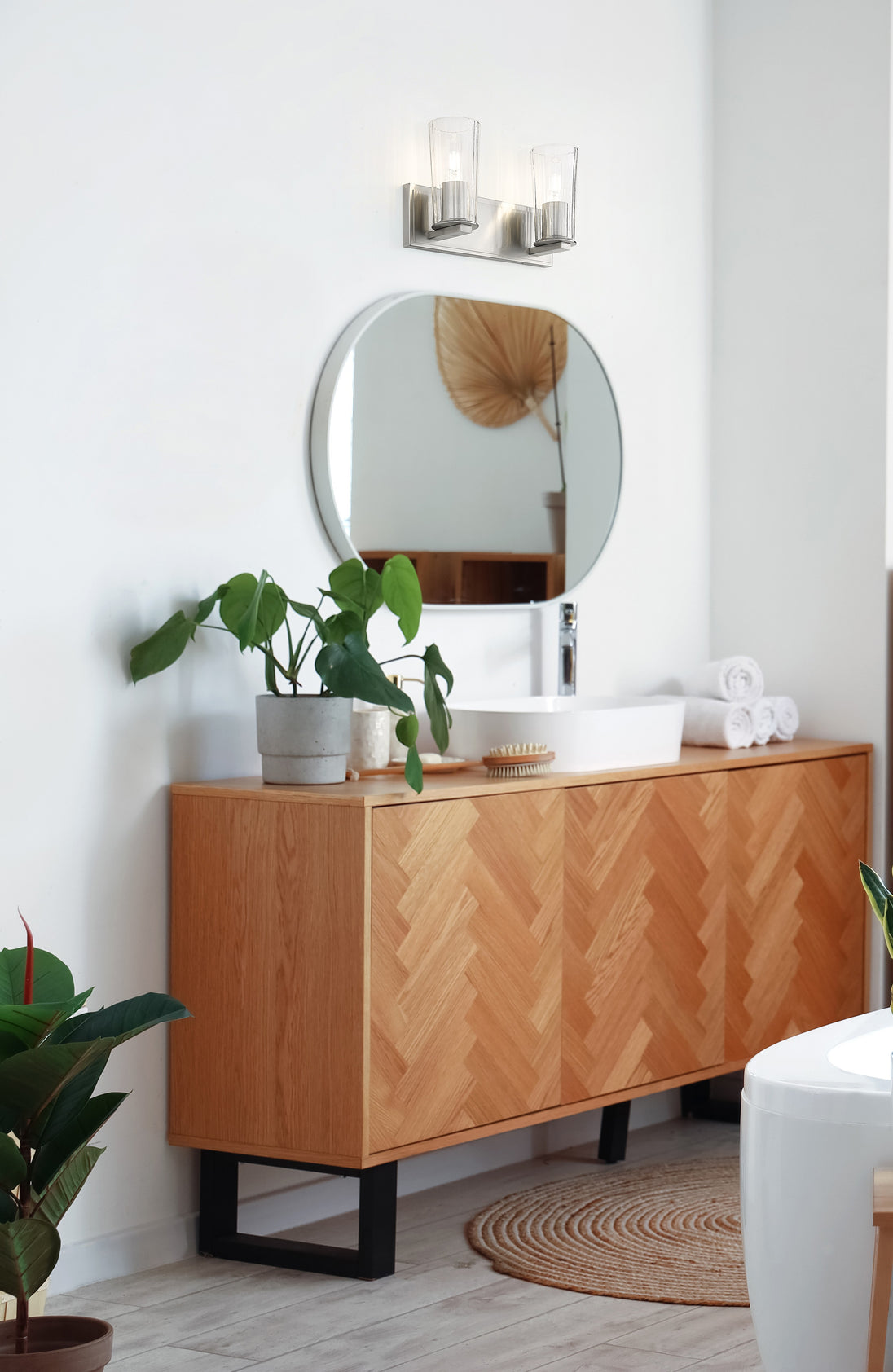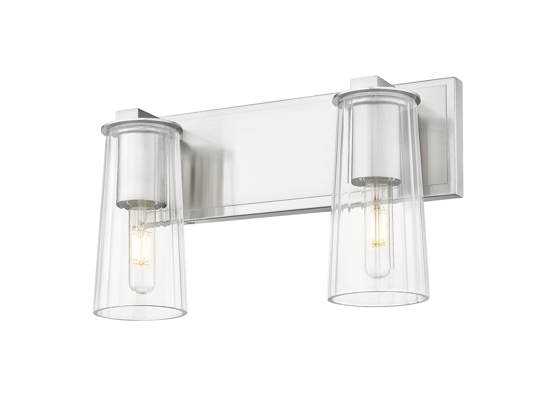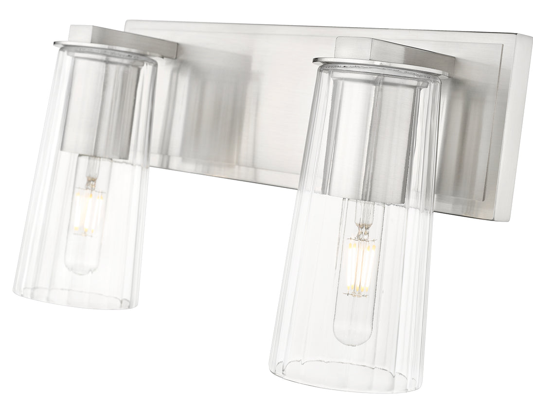 Tubular bulbs bring the perfect touch of vintage character to an industrial two-light vanity fixture. Perfect for a compact bath or as part of a larger lighting ensemble, it showcases a brushed nickel finish and clear, tapering glass shades, offering the perfect balance of materials to create a fresh perspective.