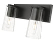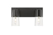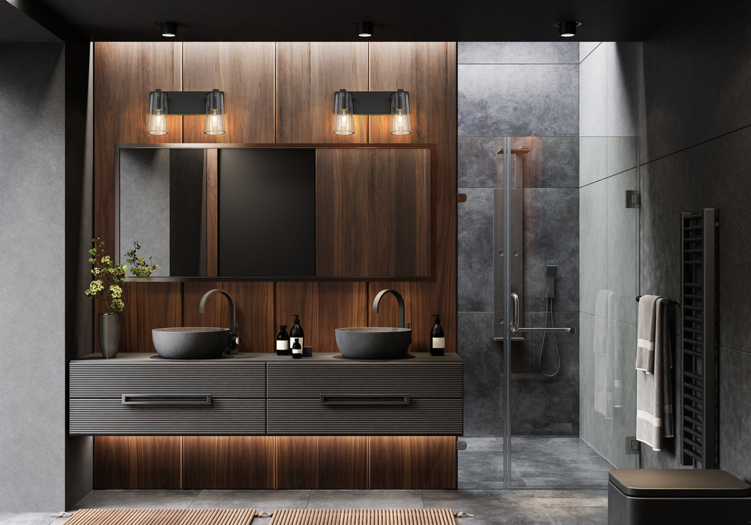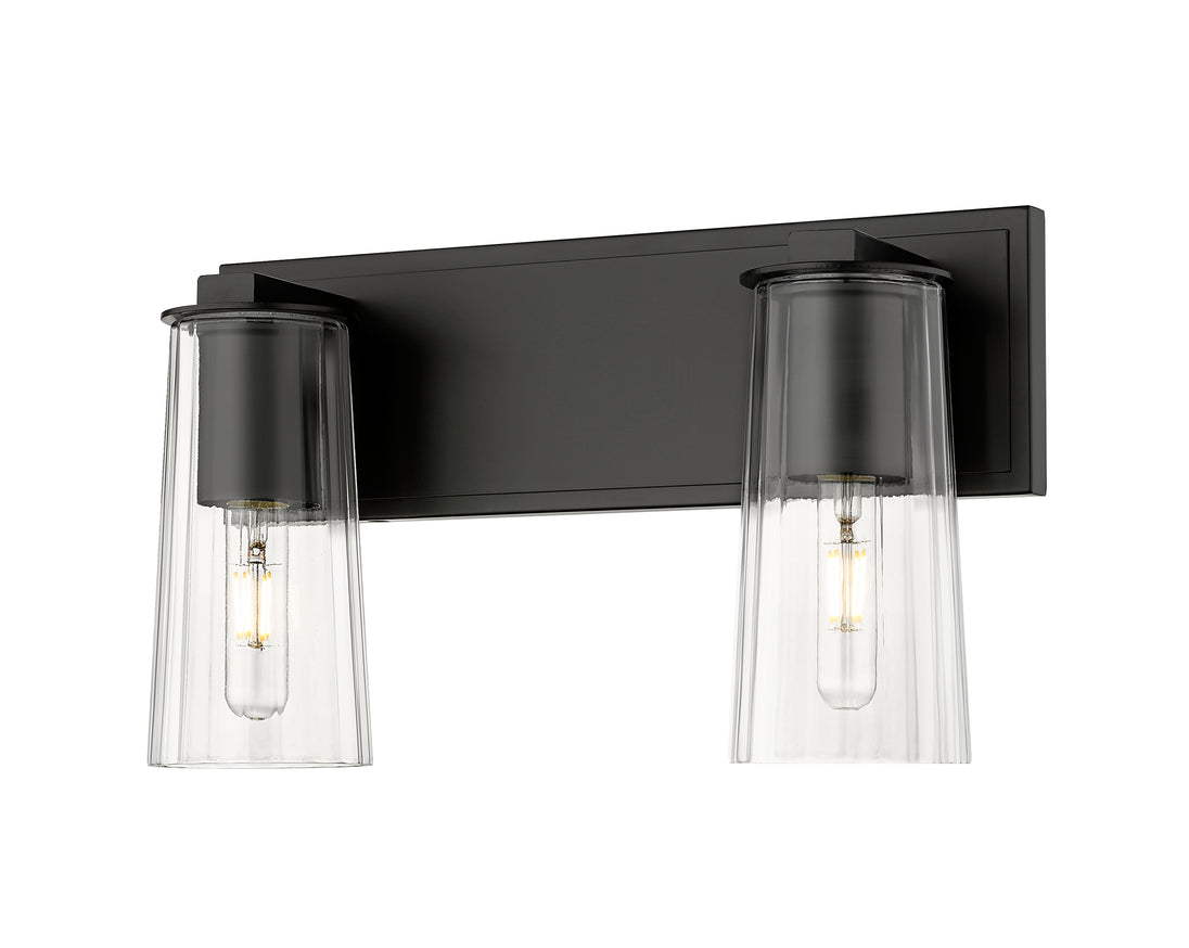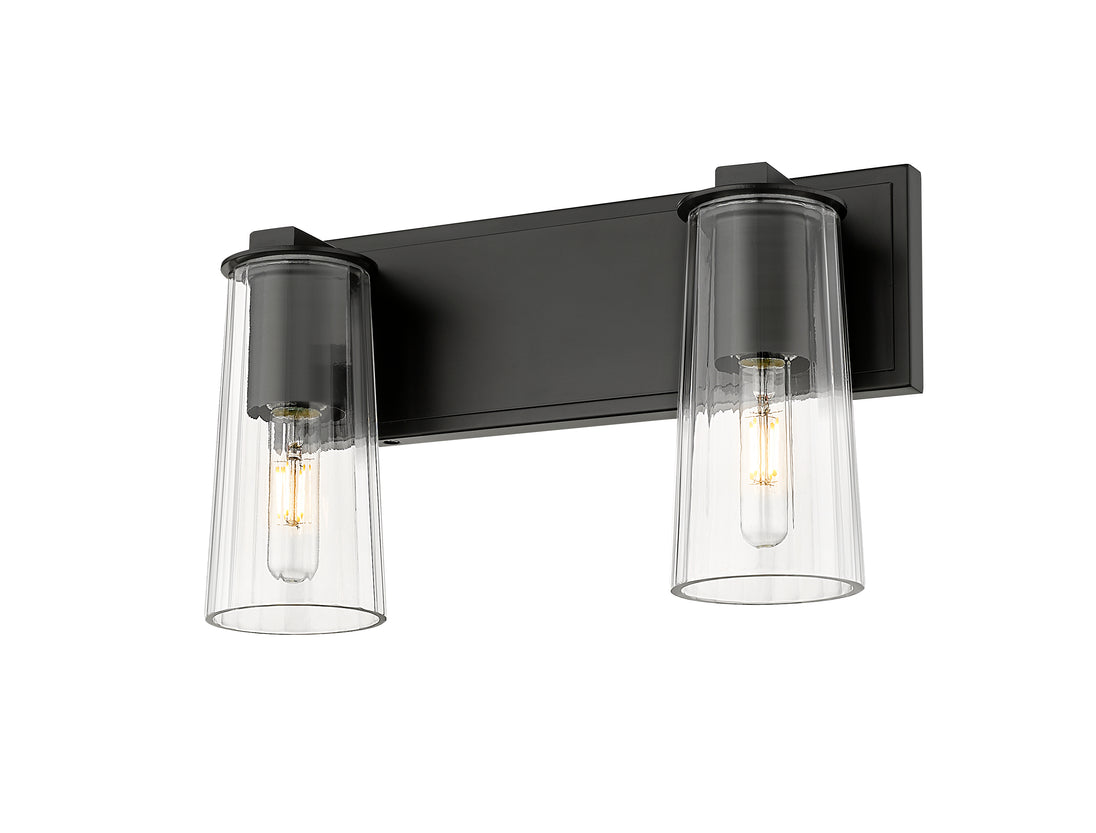 A wide rectangular wall plate in a matte black finish creates an eye-catching contrast for a modern industrial two-light vanity fixture. Its clean lines are complemented with tapered clear glass shades, each hosting a tubular bulb that contributes the perfect hint of vintage character.