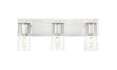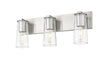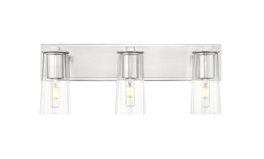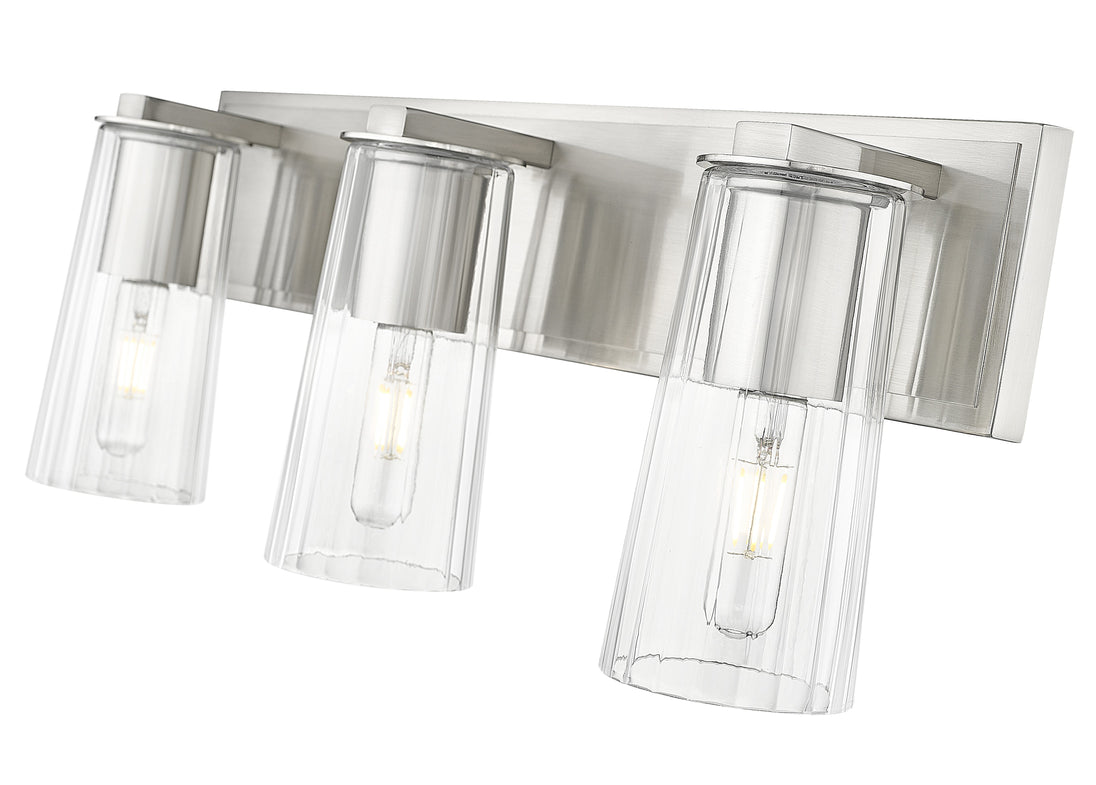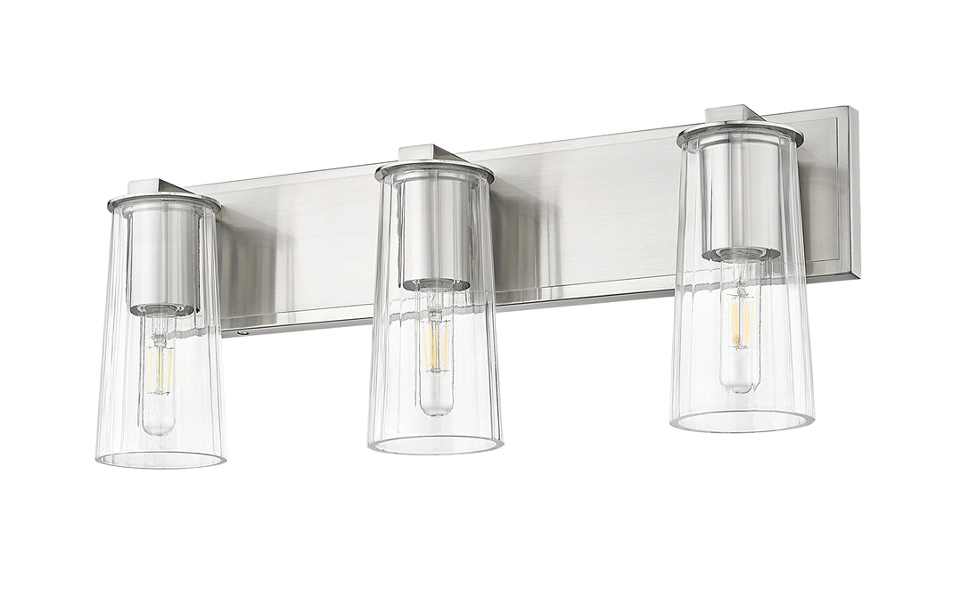 Tapering shades of clear glass assure bright, bold illumination from an industrial three-light vanity fixture. Perfect for your bath, it sets a refined, almost vintage tone with tubular bulbs tucked within tapering clear glass shades. A thick wall plate features a brushed nickel finish, offering stylish versatility in any bathroom setting.