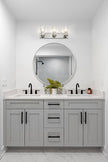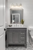 The Titus vanity series makes a bold fashion statement with tapered clear glass shades and tubular bulbs. Rings of light with the option to have the glass shade positioned up or down – along with multiple arm lengths to choose from – make this a versatile group that can be customized to many tastes. A complementary two-light wall sconce with up- and downward light will provide even illumination for make-up or grooming tasks when flanking a mirror. Titus wall fixtures can be ordered in a choice of Brushed Nickel, Matte Black, Chrome, and Modern Gold finishes; the hanging fixtures are available in Matte Black and Modern Gold.