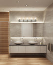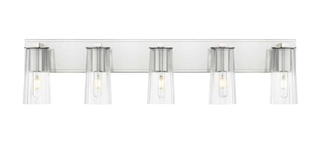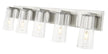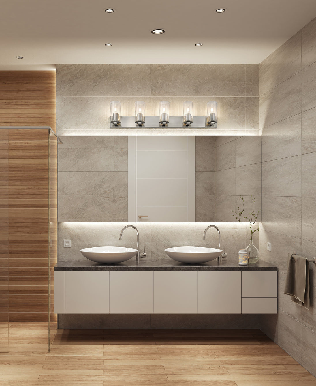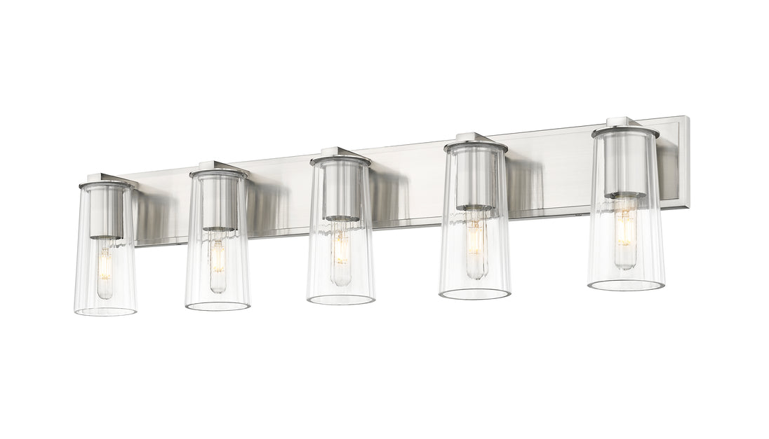 Span a vanity and sink with the linear design of an industrial five-light bath fixture. Offering bright illumination from tubular bulbs, the fixture features tapering clear glass shades that bring crisp style and radiance. A brushed nickel finish over a clean-lined structure is a perfect finishing touch.
