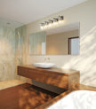 The Titus vanity series makes a bold fashion statement with tapered clear glass shades and tubular bulbs. Rings of light with the option to have the glass shade positioned up or down – along with multiple arm lengths to choose from – make this a versatile group that can be customized to many tastes. A complementary two-light wall sconce with up- and downward light will provide even illumination for make-up or grooming tasks when flanking a mirror. Titus wall fixtures can be ordered in a choice of Brushed Nickel, Matte Black, Chrome, and Modern Gold finishes; the hanging fixtures are available in Matte Black and Modern Gold.