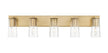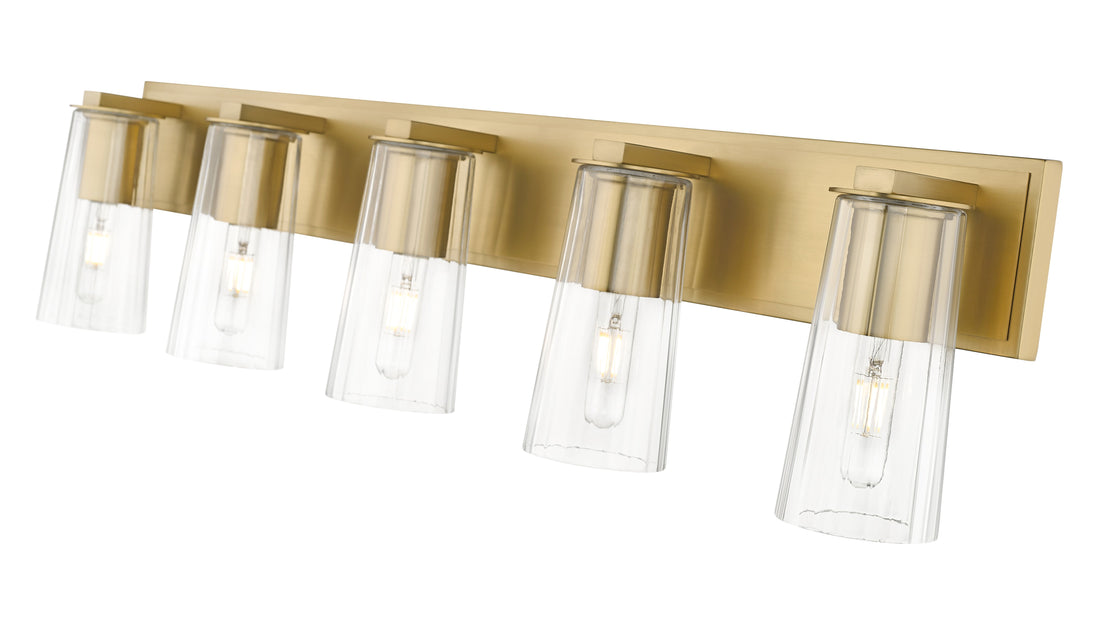 A modern gold finish introduces a sense of richness and sophistication to a modern industrial five-light vanity fixture. Offering impressive style and bright illumination, it features clear tapering glass shades for bright illumination and ambiance. Tubular bulbs add a vintage finishing touch.
