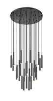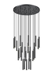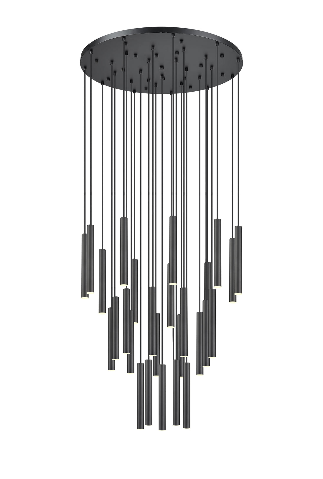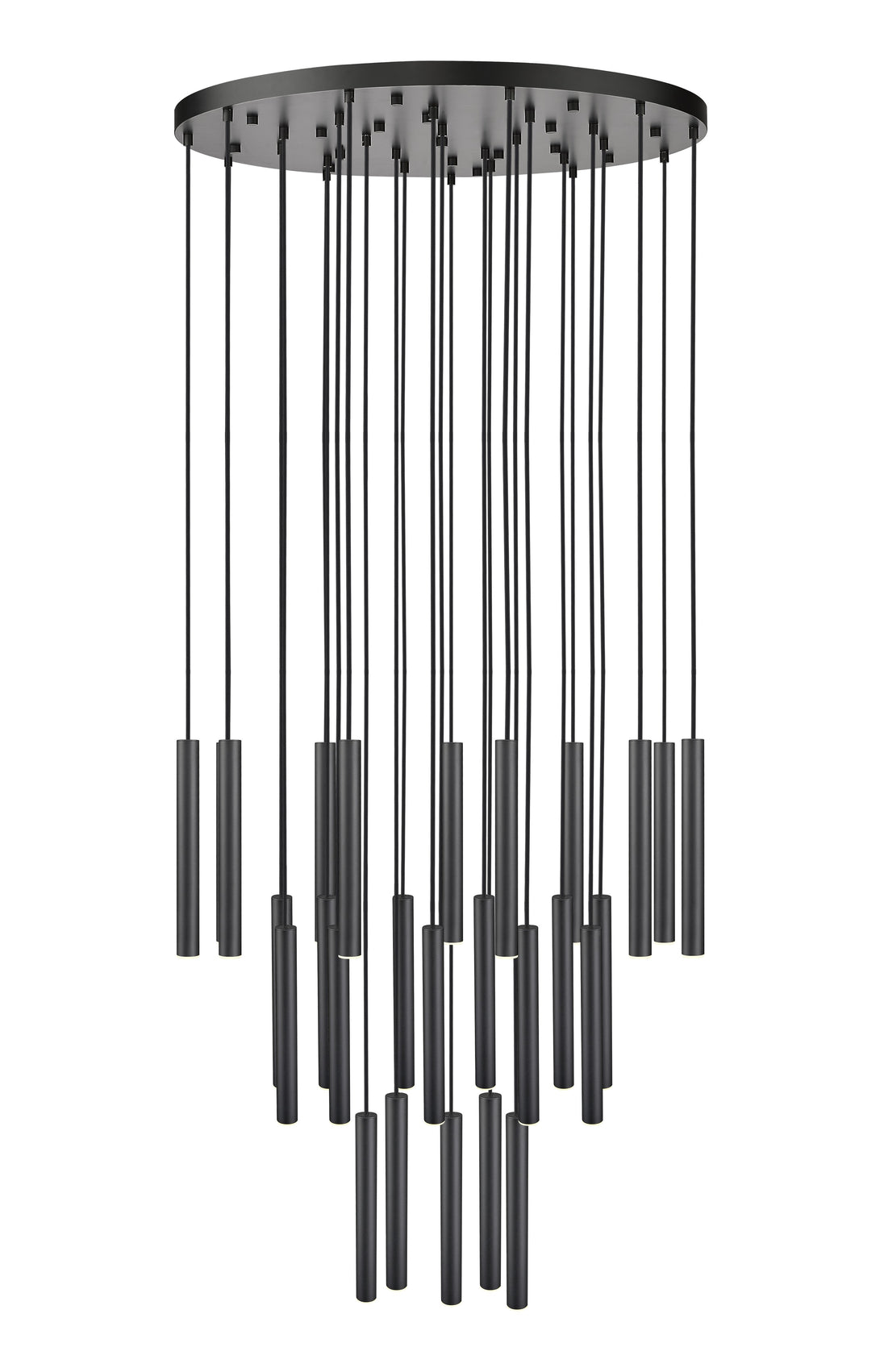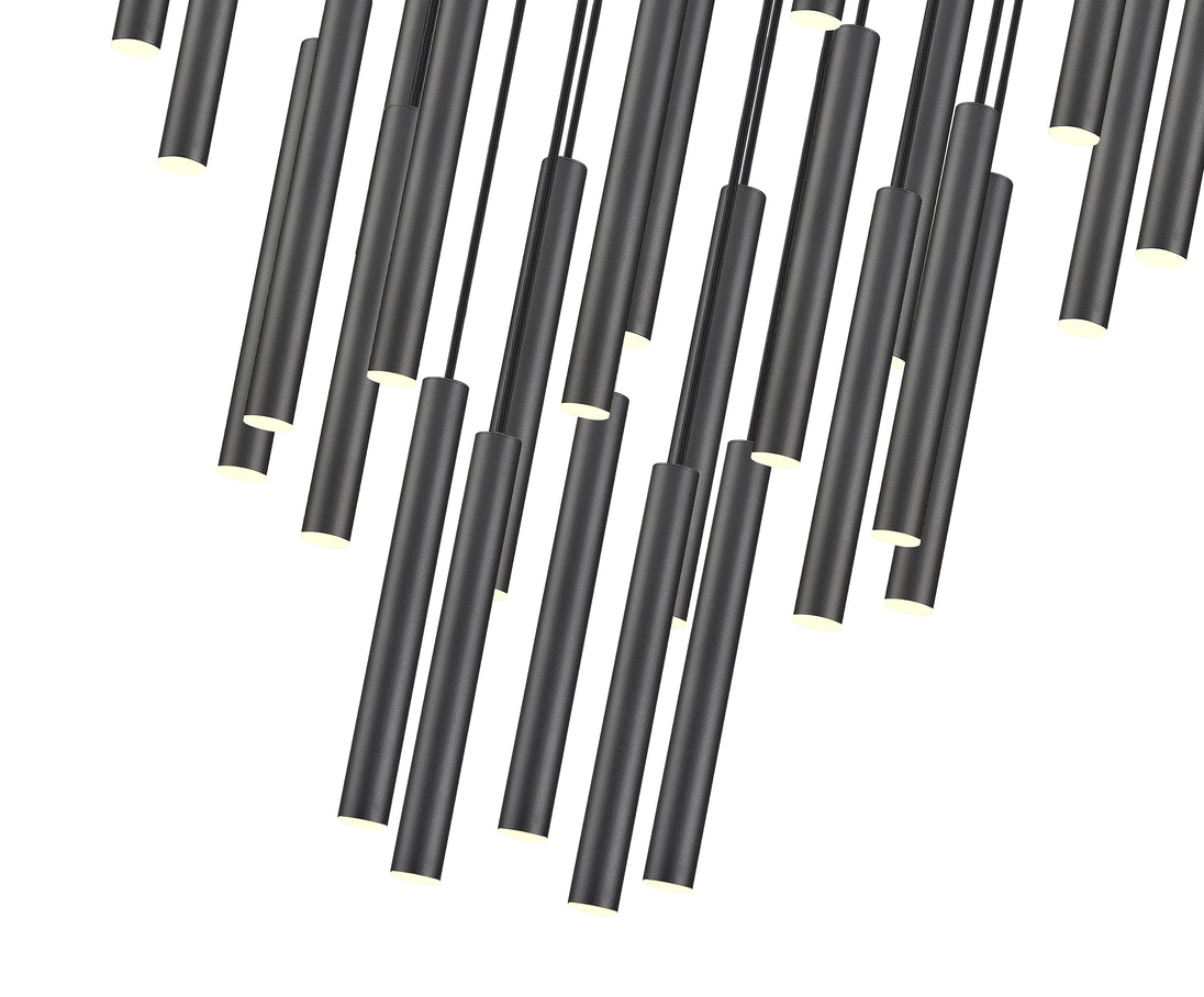 Inject a dash of bold style and contrast with this modern 27-light LED chandelier. It pairs a round canopy with slim, staggered LED lights that are dimmable for the perfect ambiance. A matte black finish ensures that this fixture stands out in any space.