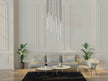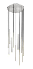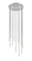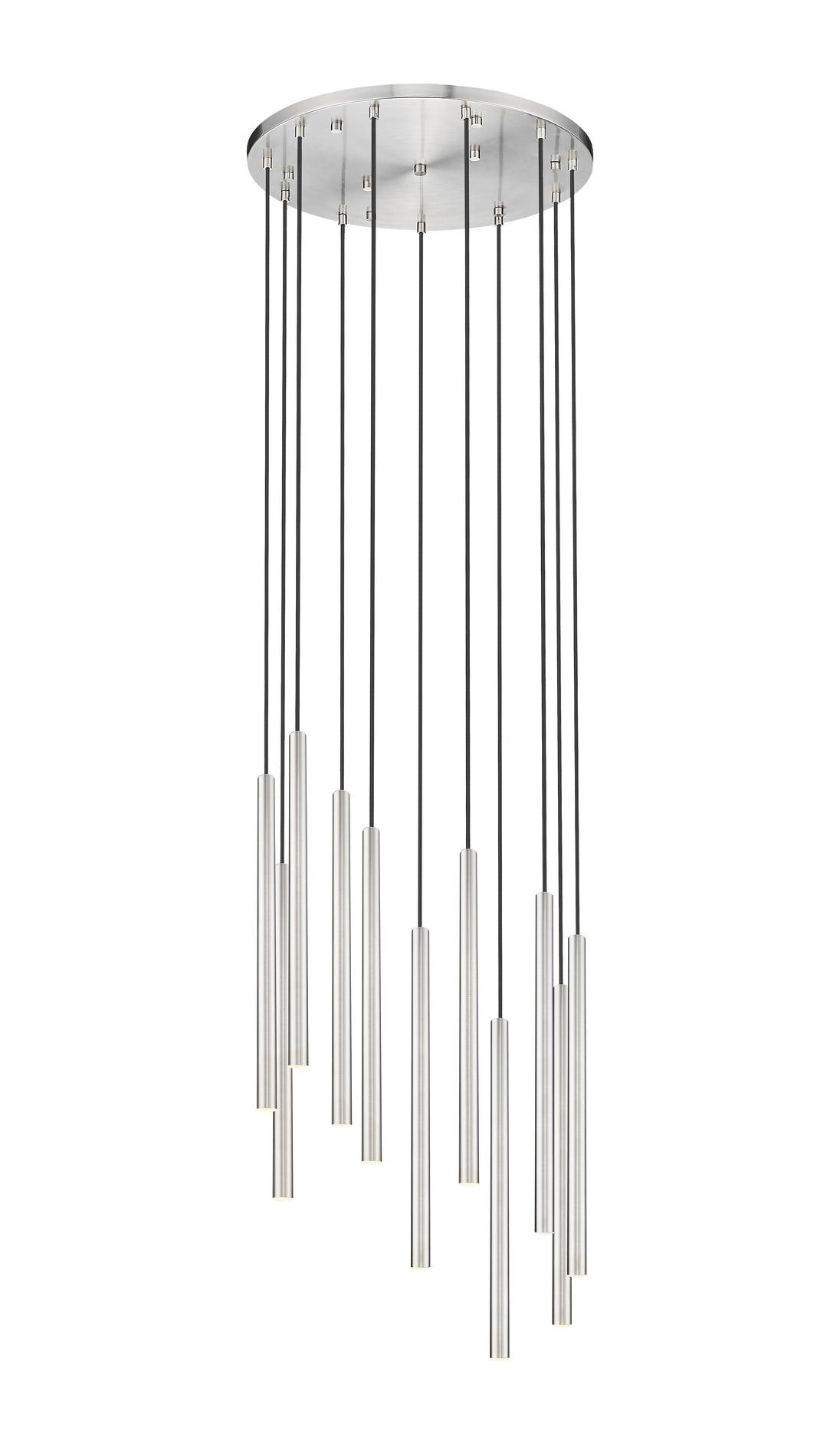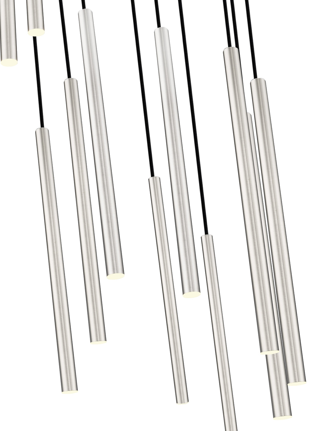 A cascading fall of slim, staggered lights create a superb silhouette for this modern 11-light chandelier. From the Forest collection, it's a sophisticated design complete with a round canopy and a brushed nickel finish that instills sleek elegance. Its integrated LEDs are dimmable and energy efficient, perfect for a contemporary home.