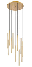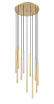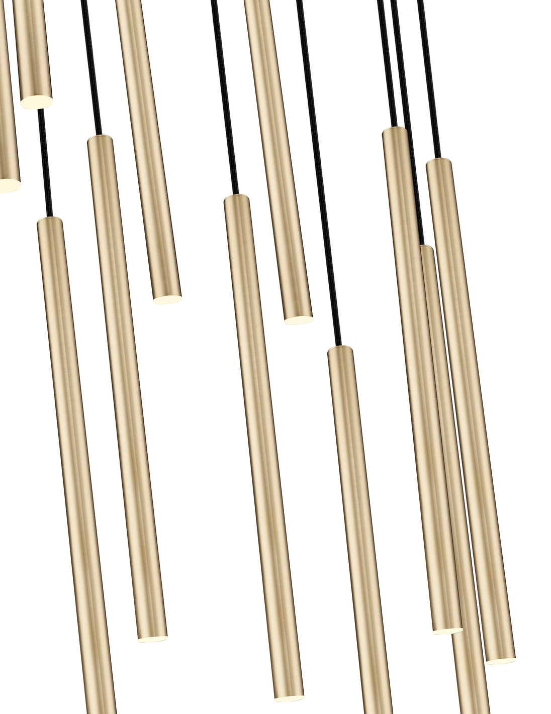 Modern gold finishing creates richness and warm sophistication for this modern 11-light chandelier. Its spiraling fall of staggered lights enchants over a foyer or dining room, with slim light housings and braided black cording. The LEDs are integrated for seamless illumination and are dimmable to create the perfect ambiance for every occasion.