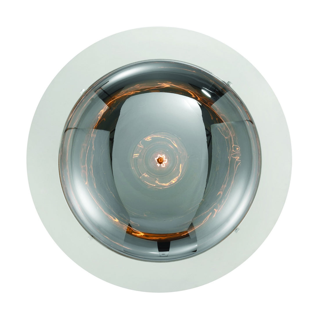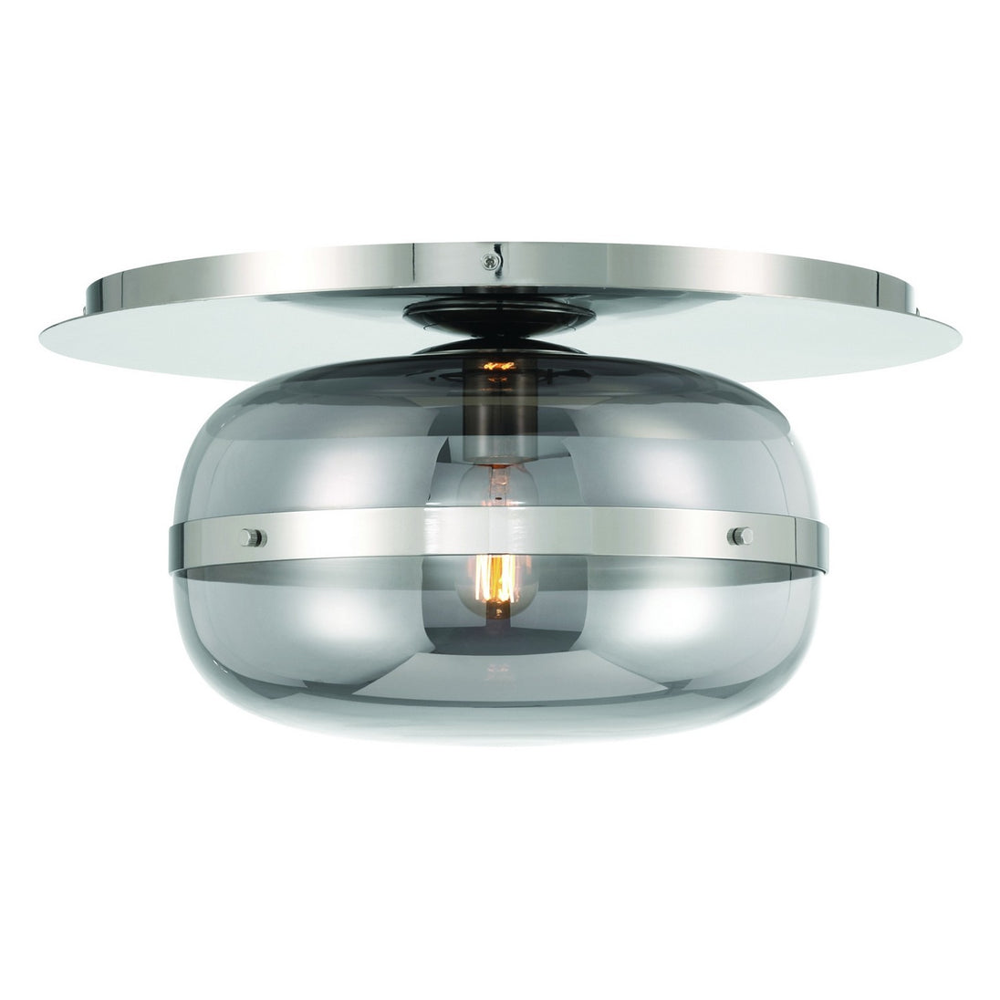 A band encircles each glass orb that beautifully reflects a warm glow from the vintage lights within. The metal support creates an inviting counterpoint to the austere design