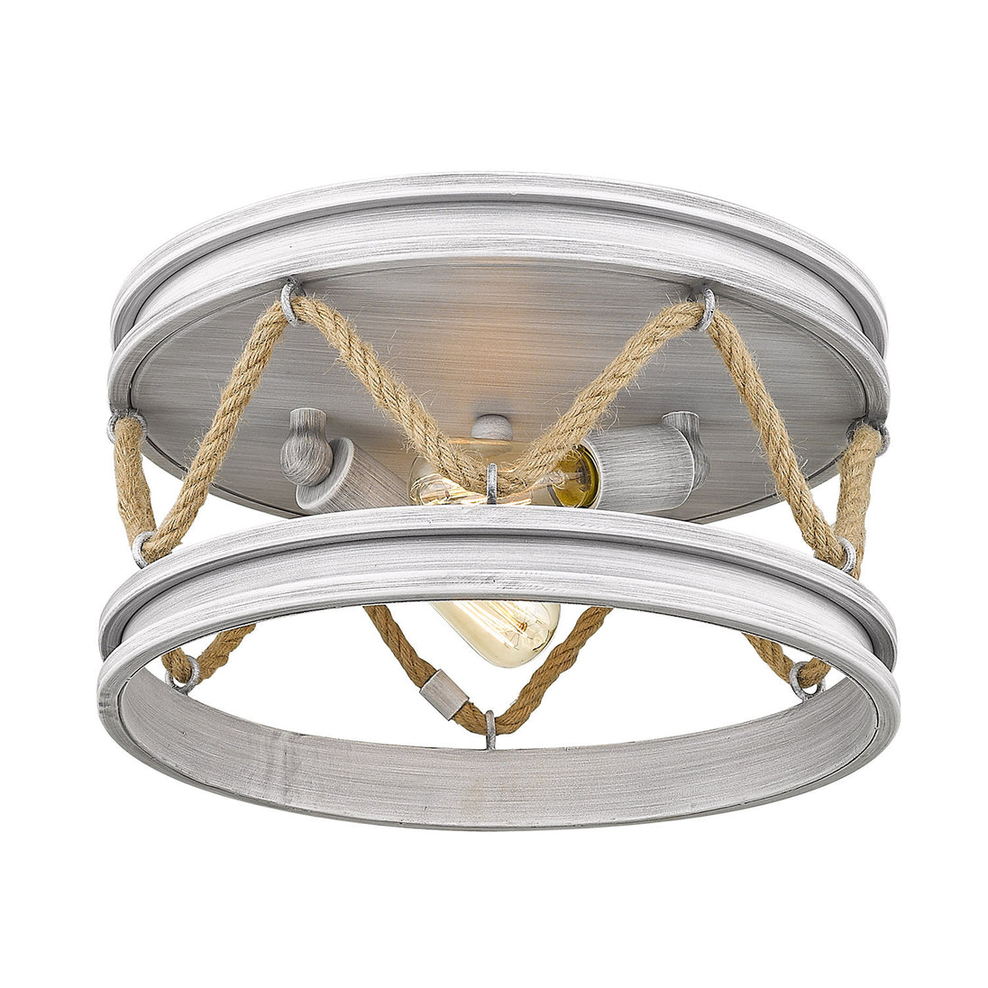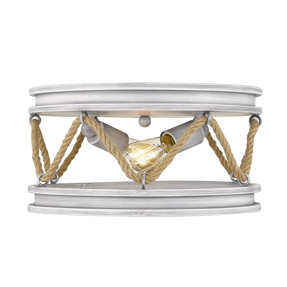 Inspired by the sea, this coastal collection features a simple design with authentic, nautical details. Tied in sailor's knots, woven ropes loop metal cleats before being suspended from maritime hooks. The contrast between the available finish options and texture of the rope and metalwork creates visual interest. This 2-light flush mount is open at the bottom to cast widespread, ambient light.