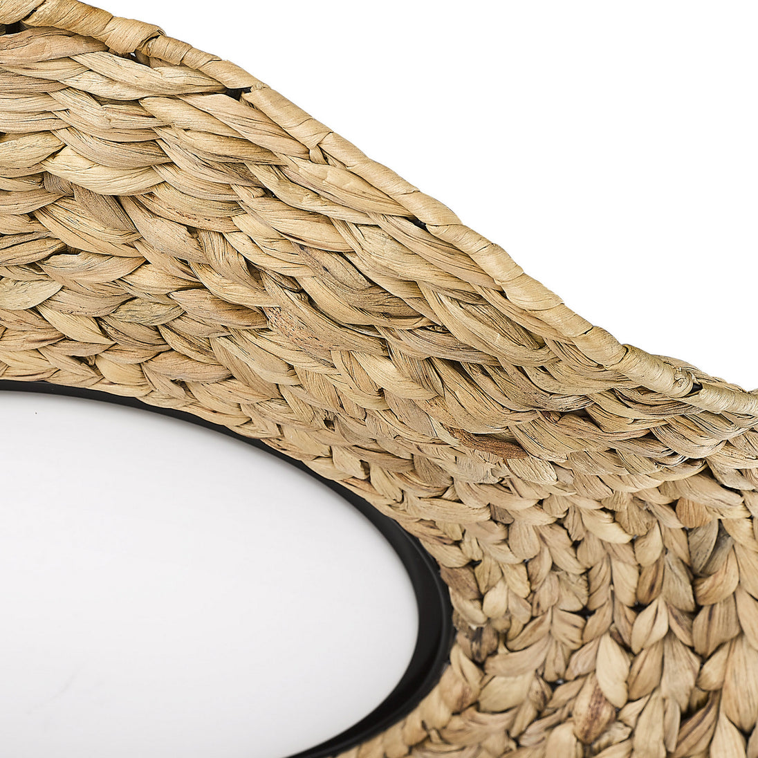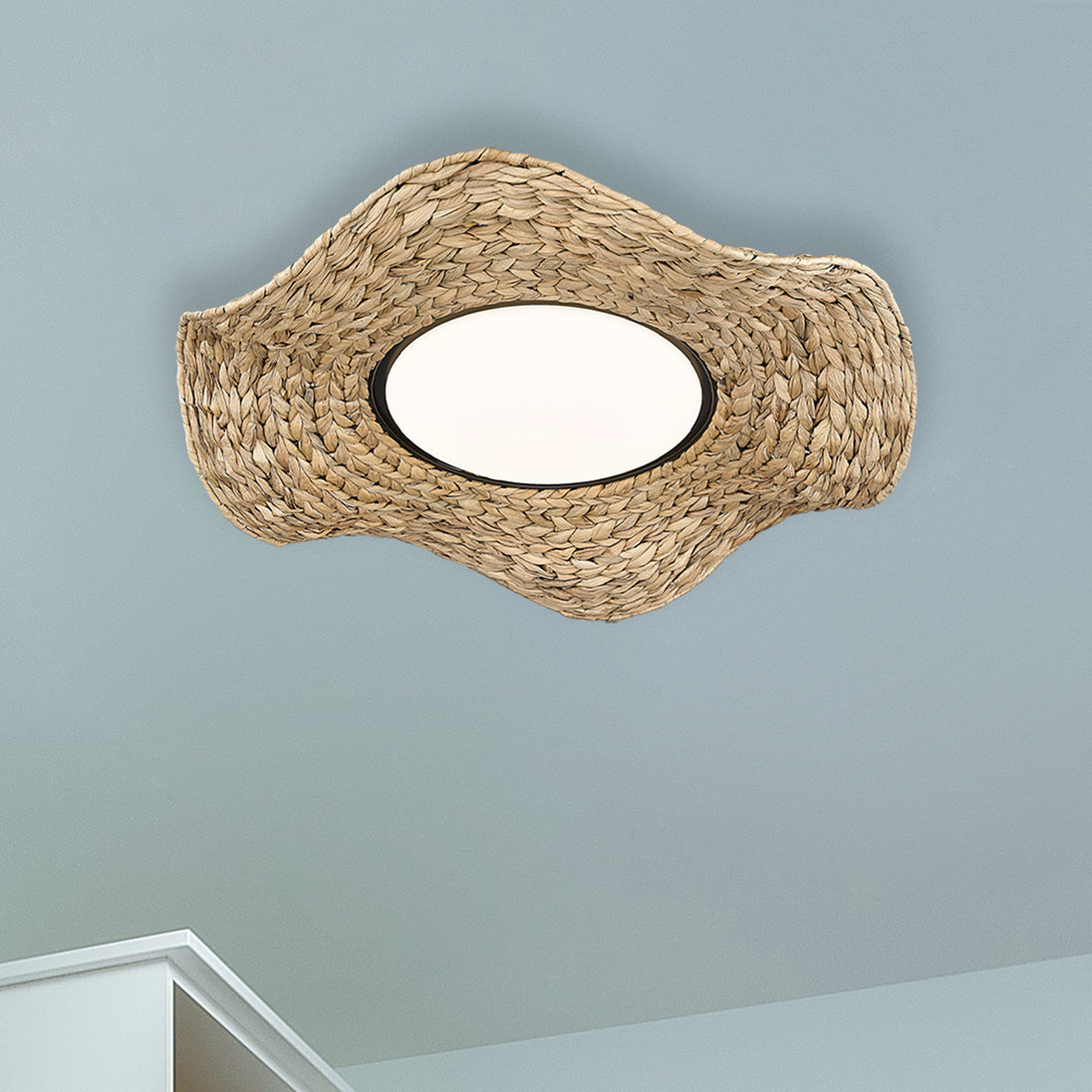 Let in summer with the coastal and casual look of Macy. Whimsical and feminine, the design is a modern and fun way to freshen your decor. Macy is nature-inspired and features a woven shade accent composed of natural sweet grass. The hand-woven traditional basket weave pattern is slightly rustic. Reminiscent of a floppy hat on a breezy day, it has an undulating shape. At the center, a round opal glass shade diffuses the brightness of the LED light source. The look of the natural fibers and Matte Black hardware coordinates well with contemporary rattan furnishings. Hang this damp-rated, close-to-ceiling flush mount anywhere in your home.