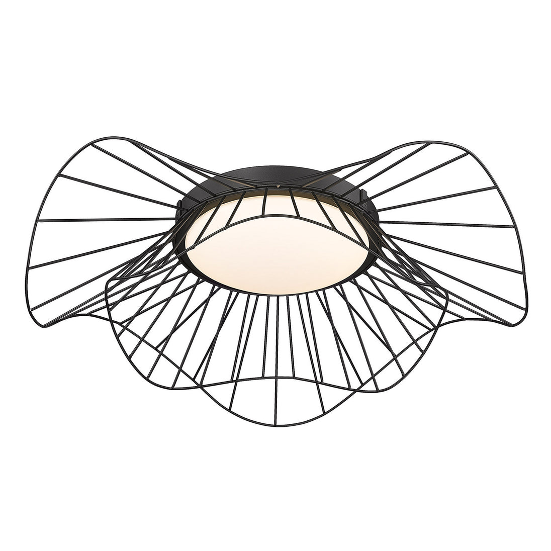 Artful and uncompromised, Elena stretches the imagination of contemporary close-to-ceiling lighting. An oversized wireframe is sculpted into alternating bends and curves to form an attractive, organic pattern. A slightly textured Natural Black finish contrasts an opal glass shade. Beneath the shade, an integrated LED shines brightly. Hang these damp-rated fixtures throughout your home.