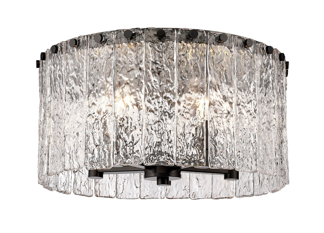 Artistry joins industrial minimalism to produce a compelling look in light fixtures that work in both modern and transitional settings. The Glacier five-light flush mount ceiling light offers a decadent look of individual clear textured glass panels that emulate melting ice, an extraordinary effect with dramatic impact in a kitchen or bar space. Matte black finish steel is placed as a crown frame, adding a contrast in both style and finish and embellishing the optical delight accomplished when the fixture is illuminated.