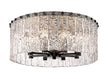 Adding a compelling mix of artistry and natural elements to the mix, this round flush mount ceiling light captures the imagination. The Glacier round eight-light flush mount ceiling light offers a decadent look of individual clear textured glass panels that emulate melting ice, an extraordinary effect with dramatic impact in a foyer, kitchen, or main living area. Matte black finish steel is placed as a crown frame, adding a contrast in both style and finish and embellishing the optical delight accomplished when the fixture is illuminated.
