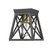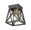 Indulge in an exercise of geometrics and stunning interior décor, adding this single-light flush mount ceiling light to a compact living space. Dramatic Matte Black delivers a bold finish to a cage-style metal shade that nestles a wide bulb mount with a rich Old Brass finish, creating a custom look for a transitional setting.