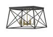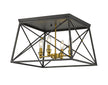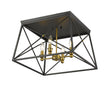 Indulge in an exercise of geometrics and stunning interior décor, adding this four-light flush mount ceiling light to a main living space. With an angular, open-concept cage frame made from Matte Black finish metal, its charming Old Brass finish candelabra bulb base offers a delightful contrast.
