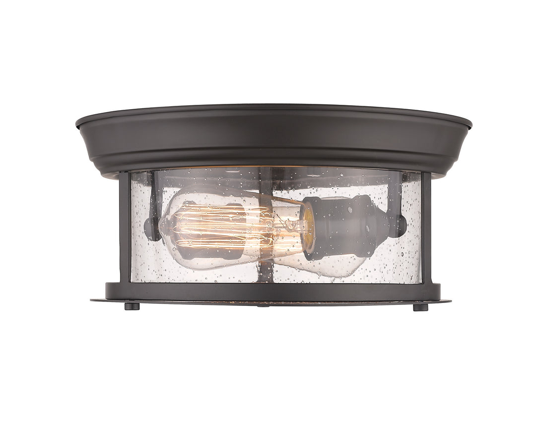 Cool industrial ambiance offers a stylish look to transitional spaces in need of functional, fashionable fixtures. With beautiful Bronze finish metal providing a circular cage-like frame and a wide cylindrical clear seedy glass shade completing its visual package, this two-light flush mount ceiling light wraps up a custom kitchen or living area design.