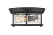 Cool industrial ambiance offers a stylish look to transitional spaces in need of functional, fashionable fixtures. With bold Matte Black finish metal providing a circular cage-like frame and a wide cylindrical clear seedy glass shade completing its visual package, this two-light flush mount ceiling light wraps up a custom kitchen or living area design.