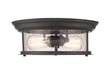 Cool industrial ambiance offers a stylish look to transitional spaces in need of functional, fashionable fixtures. With beautiful Bronze finish metal providing a circular cage-like frame and a wide cylindrical clear seedy glass shade completing its visual package, this two-light flush mount ceiling light offers a focal point in a redesigned space devoted to carefree living.